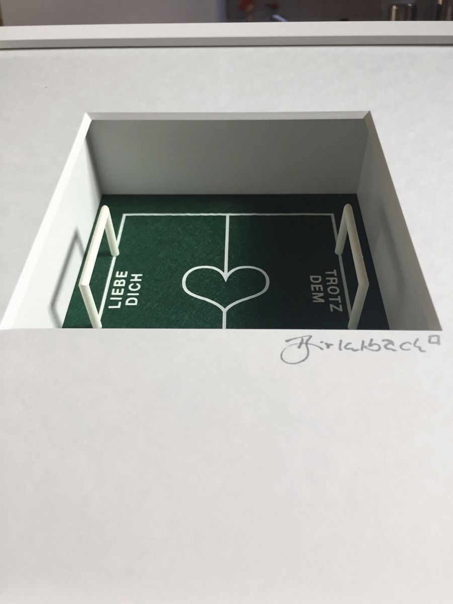 Die Exponate aus der Serie „Schöne Momente“ bestehen im wesentlichen aus fünf Bestandteilen: einem Objektkasten mit Hintergrundplatte aus Leinen-Kappa (1), einem dreidimensionalem Objektgegenstand (2), einem aufgeklebtem Passpartout (3) und einer Abdeckung durch eine fast blendfreie Verglasung (4) sowie einem hochwertigem Holz-Bilderrahmen (5). Die 3D-Objektgegenstände werden von Designern und CAD-Spezialisten nach Vorgabe entwickelt und mit modernsten 3D-Druckern erzeugt bzw. gefräst oder laser-gecutttet. Weitere dreidimensionale Gestaltungselemente ergänzen die Wort-Bild-Collagen. Die einzelnen Produktbestandteile werden kunsthandwerklich zusammengefügt und können daher leicht von der Darstellung im Katalog abweichen. Auf der Rückseite des Exponates ist ein Zertifikat angebracht, dass die Echtheit bestätigt und die Seriennummer ausweist. Es ist vom Künstler unterschrieben.