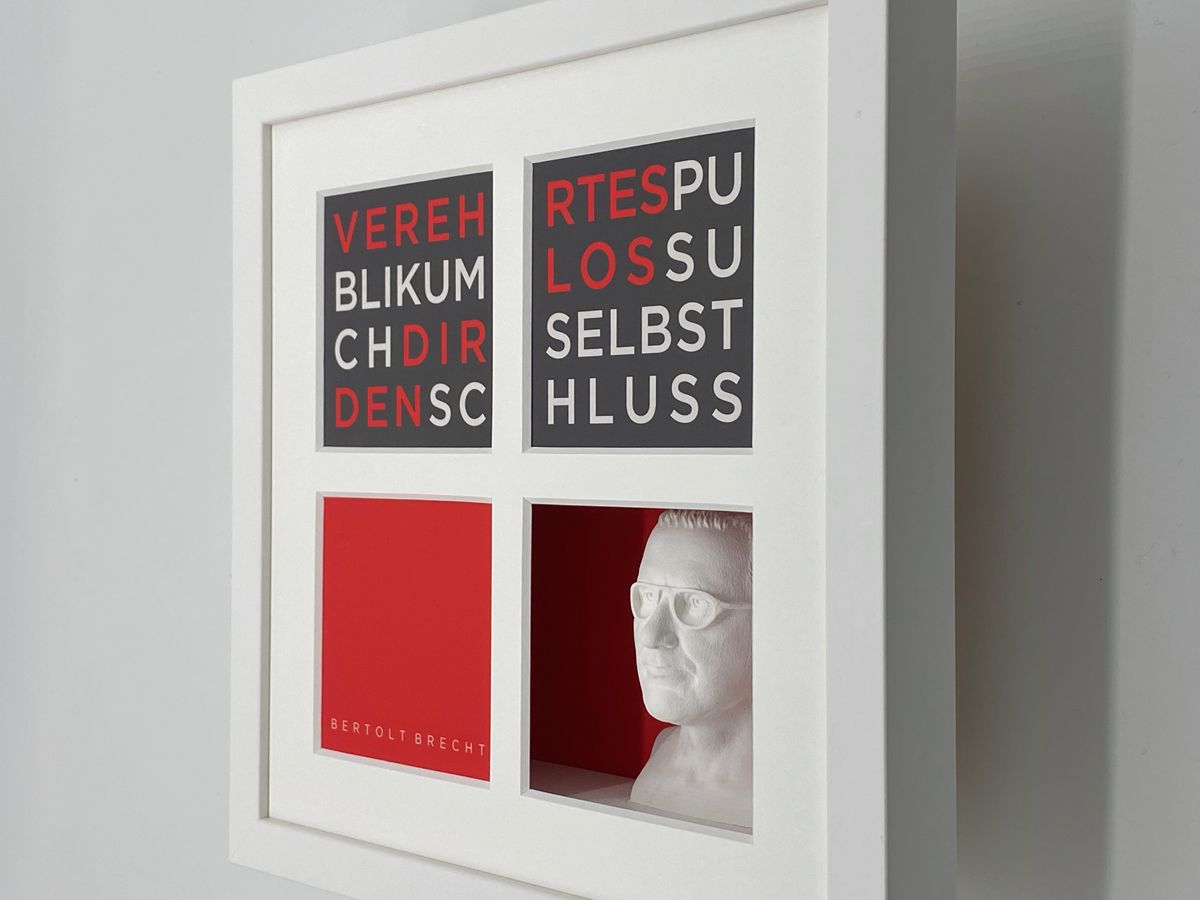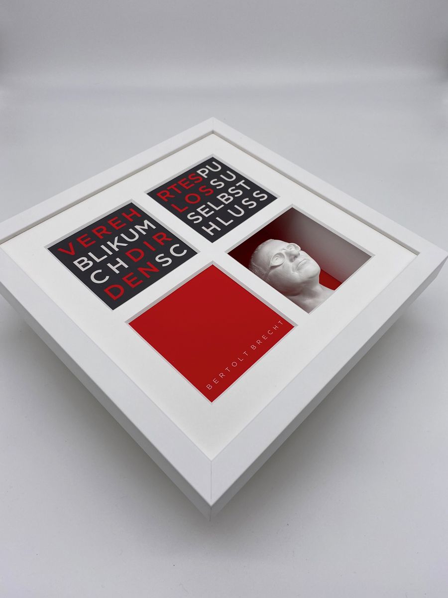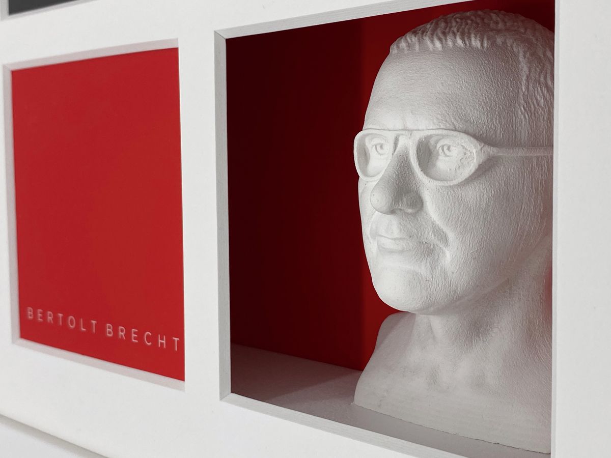 Die Exponate aus der Serie Büstenbilder bestehen im wesentlichen aus fünf Bestandteilen: einem Objektkasten mit eingesetzter 3D-Gipsbüste (1), einem aufgelegtem Digitalkarton (2), einem vierfach gestanztem Passpartout (3), einer blendfreien Verglasung (4) und einem hochwertigen Holz-Bilderrahmen (5). Die einzelnen Produktbestandteile werden kunsthandwerklich zusammengefügt nachdem die Büsten vor dem Einsetzen individuell geschliffen wurden. Daher können die Exponate leicht von der Darstellung im Katalog abweichen. Auf der Rückseite des Exponates ist ein Zertifikat angebracht, dass die Echtheit bestätigt und die Seriennummer ausweist. Es ist vom Künstler unterschrieben.