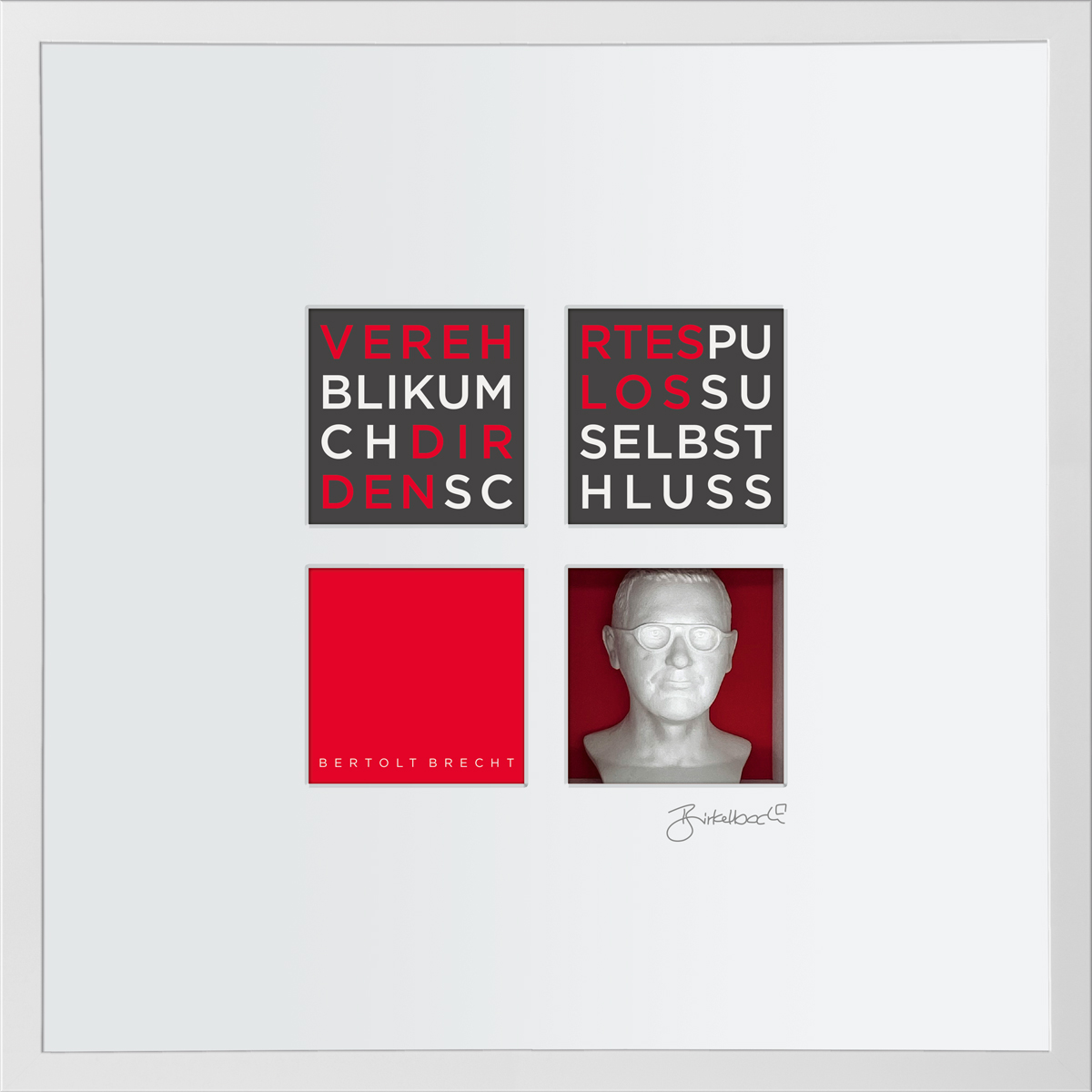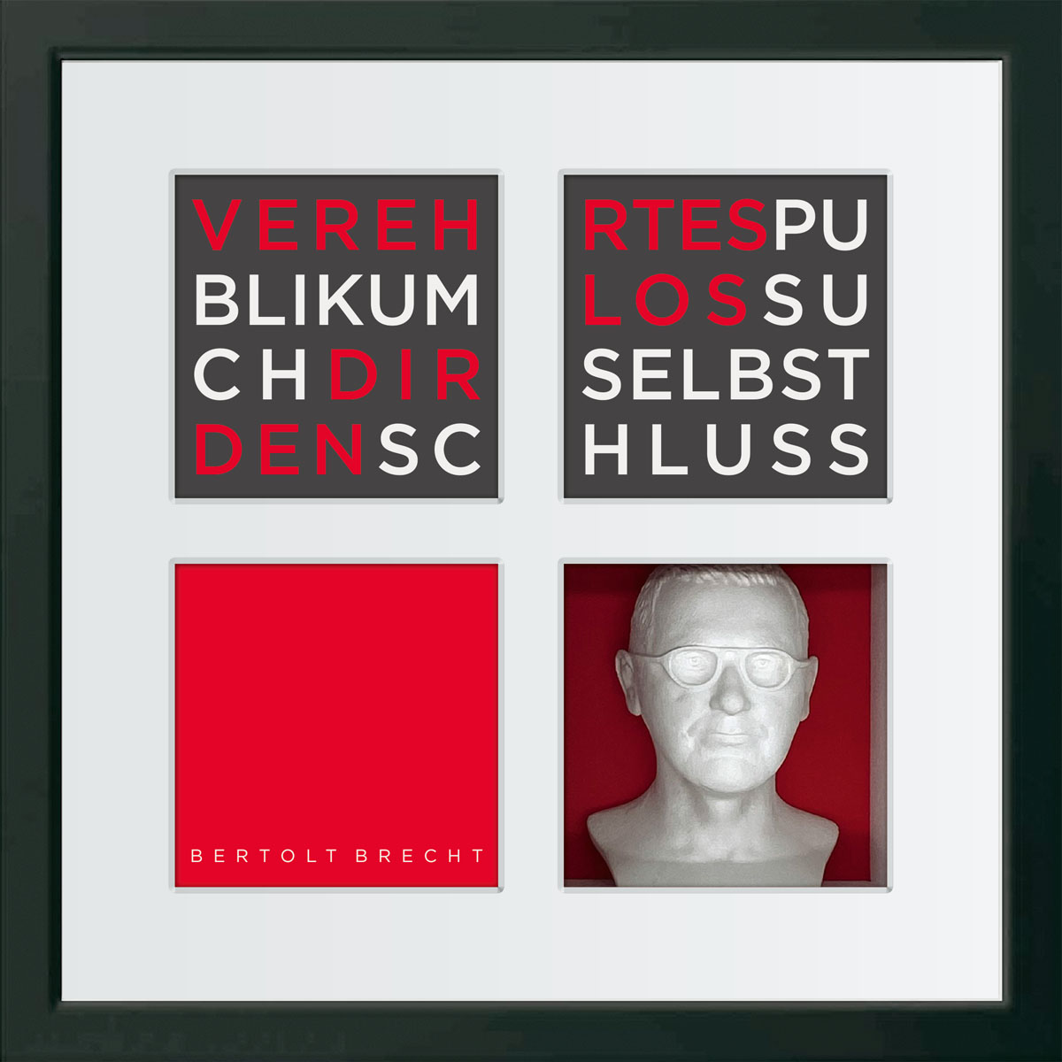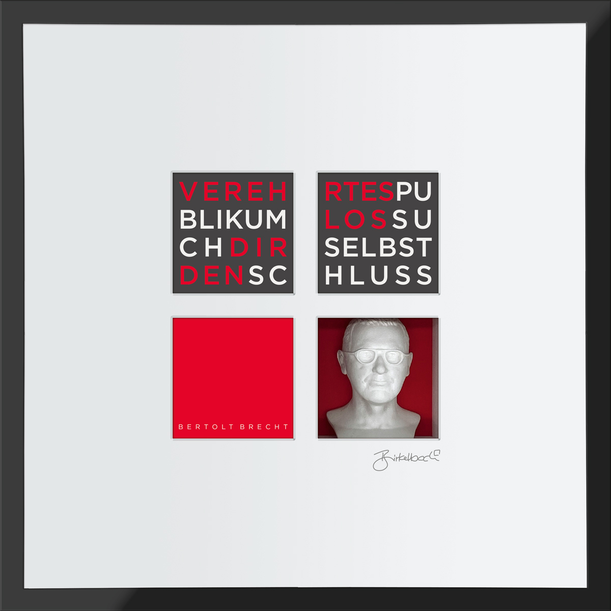 Die Exponate aus der Serie Büstenbilder bestehen im wesentlichen aus fünf Bestandteilen: einem Objektkasten mit eingesetzter 3D-Gipsbüste (1), einem aufgelegtem Digitalkarton (2), einem vierfach gestanztem Passpartout (3), einer blendfreien Verglasung (4) und einem hochwertigen Holz-Bilderrahmen (5). Die einzelnen Produktbestandteile werden kunsthandwerklich zusammengefügt nachdem die Büsten vor dem Einsetzen individuell geschliffen wurden. Daher können die Exponate leicht von der Darstellung im Katalog abweichen. Auf der Rückseite des Exponates ist ein Zertifikat angebracht, dass die Echtheit bestätigt und die Seriennummer ausweist. Es ist vom Künstler unterschrieben.