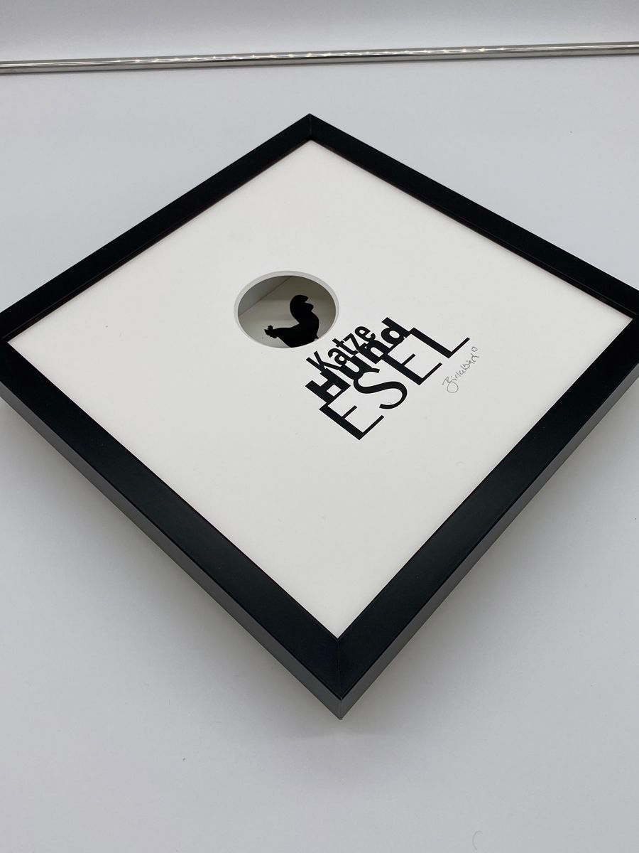 Die Exponate aus der Serie „Schöne Momente“ bestehen im wesentlichen aus fünf Bestandteilen: einem Objektkasten mit Hintergrundplatte aus Leinen-Kappa (1), einem dreidimensionalem Objektgegenstand (2), einem aufgeklebtem Passpartout (3) und einer Abdeckung durch eine fast blendfreie Verglasung (4) sowie einem hochwertigem Holz-Bilderrahmen (5). Die 3D-Objektgegenstände werden von Designern und CAD-Spezialisten nach Vorgabe entwickelt und mit modernsten 3D-Druckern erzeugt bzw. gefräst oder laser-gecutttet. Weitere dreidimensionale Gestaltungselemente ergänzen die Wort-Bild-Collagen. Die einzelnen Produktbestandteile werden kunsthandwerklich zusammengefügt und können daher leicht von der Darstellung im Katalog abweichen. Auf der Rückseite des Exponates ist ein Zertifikat angebracht, dass die Echtheit bestätigt und die Seriennummer ausweist. Es ist vom Künstler unterschrieben.