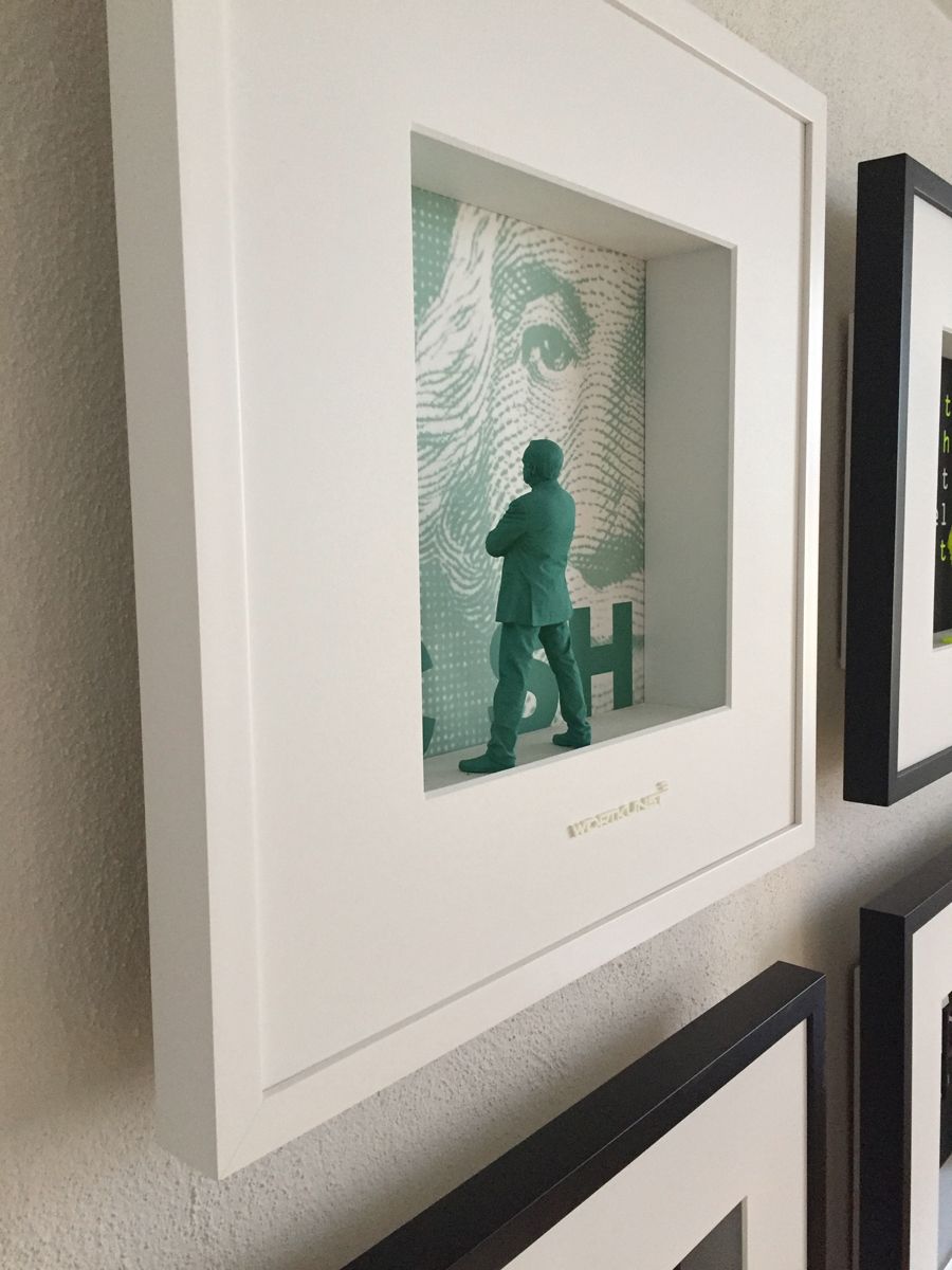 „Die Exponate aus der Serie „wortkunst3 I Objektbilder“ bestehen im wesentlichen aus vier bzw. fünf Bestandteilen: einem Objektkasten mit Hintergrundplatte aus Leinen-Kappa (1), einem dreidimensionalem Objektgegenstand (2), einem CNC-gefrästem und hochwertig lackiertem Holz-Passpartout (3) und einem hochwertigem Holz-Bilderrahmen (4). Optional sind die meisten Exponate mit einer fast blendfreien Verglasung erhältlich (5). Auf der Rückseite des Exponates ist ein Zertifikat angebracht, dass die Echtheit bestätigt und die Seriennummer ausweist. Die 3D-Objektgegenstände werden von Designern und CAD-Spezialisten nach Vorgabe entwickelt und mit modernsten 3D-Druckern erzeugt bzw. gefräst oder laser-gecutttet. Weitere dreidimensionale Gestaltungselemente ergänzen die Wort-Bild-Collagen. Die einzelnen Produktbestandteile werden kunsthandwerklich zusammengefügt und können daher leicht von der Darstellung im Katalog abweichen. Auf der Rückseite des Exponates ist ein Zertifikat angebracht, dass die Echtheit bestätigt und die Seriennummer ausweist. Es ist vom Künstler unterschrieben.“