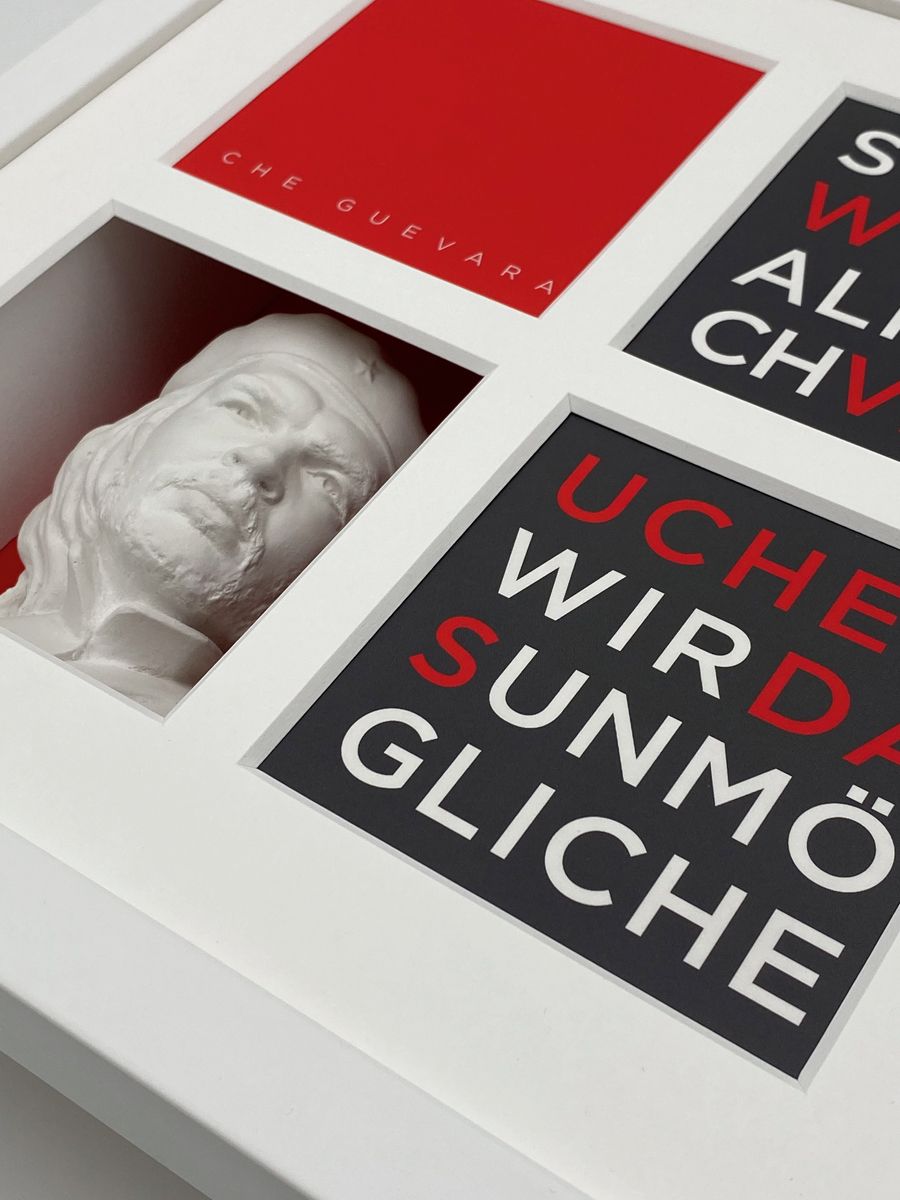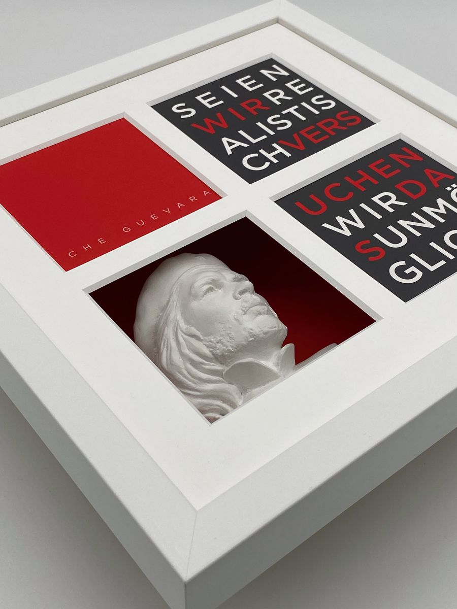 Die Exponate aus der Serie Büstenbilder bestehen im wesentlichen aus fünf Bestandteilen: einem Objektkasten mit eingesetzter 3D-Gipsbüste (1), einem aufgelegtem Digitalkarton (2), einem vierfach gestanztem Passpartout (3), einer blendfreien Verglasung (4) und einem hochwertigen Holz-Bilderrahmen (5). Die einzelnen Produktbestandteile werden kunsthandwerklich zusammengefügt nachdem die Büsten vor dem Einsetzen individuell geschliffen wurden. Daher können die Exponate leicht von der Darstellung im Katalog abweichen. Auf der Rückseite des Exponates ist ein Zertifikat angebracht, dass die Echtheit bestätigt und die Seriennummer ausweist. Es ist vom Künstler unterschrieben.