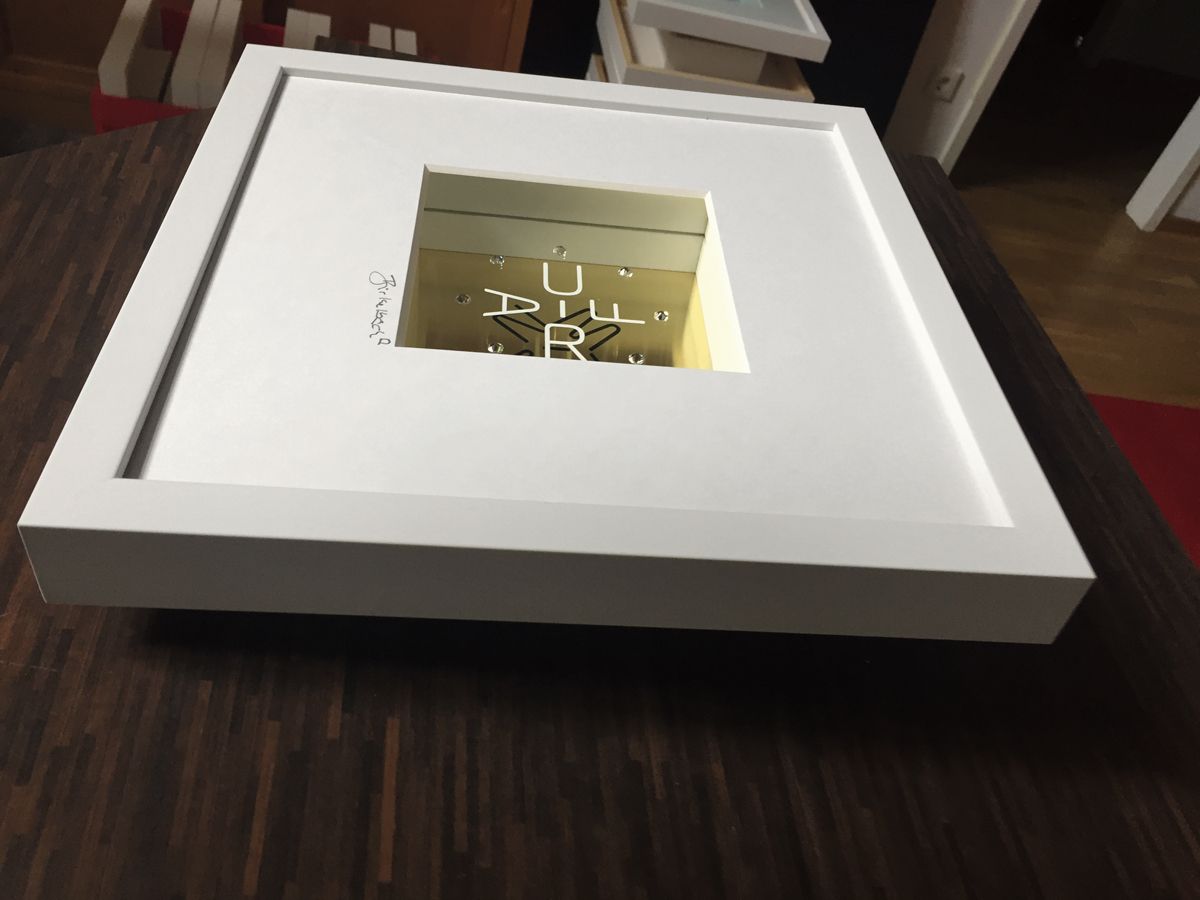 Die Exponate aus der Serie „Schöne Momente“ bestehen im wesentlichen aus fünf Bestandteilen: einem Objektkasten mit Hintergrundplatte aus Leinen-Kappa (1), einem dreidimensionalem Objektgegenstand (2), einem aufgeklebtem Passpartout (3) und einer Abdeckung durch eine fast blendfreie Verglasung (4) sowie einem hochwertigem Holz-Bilderrahmen (5). Die 3D-Objektgegenstände werden von Designern und CAD-Spezialisten nach Vorgabe entwickelt und mit modernsten 3D-Druckern erzeugt bzw. gefräst oder laser-gecutttet. Weitere dreidimensionale Gestaltungselemente ergänzen die Wort-Bild-Collagen. Die einzelnen Produktbestandteile werden kunsthandwerklich zusammengefügt und können daher leicht von der Darstellung im Katalog abweichen. Auf der Rückseite des Exponates ist ein Zertifikat angebracht, dass die Echtheit bestätigt und die Seriennummer ausweist. Es ist vom Künstler unterschrieben.