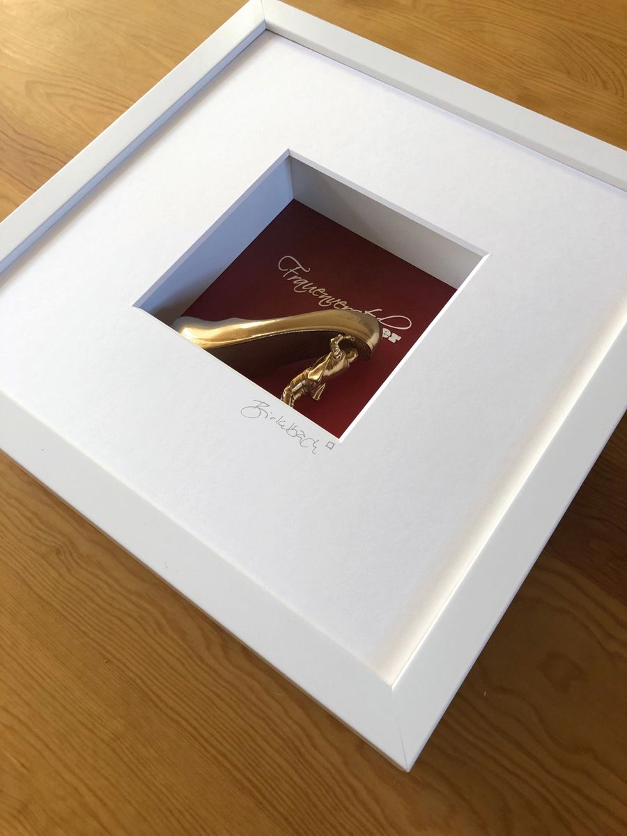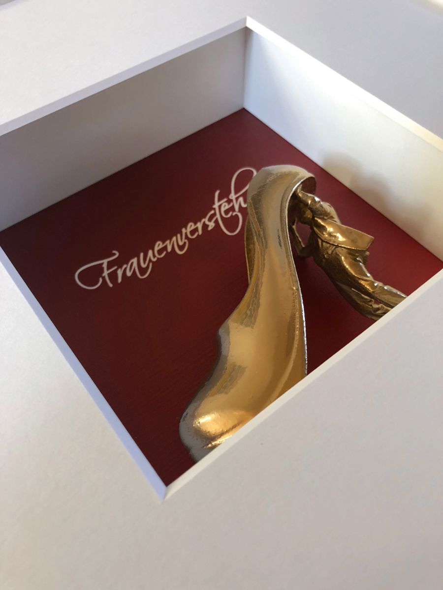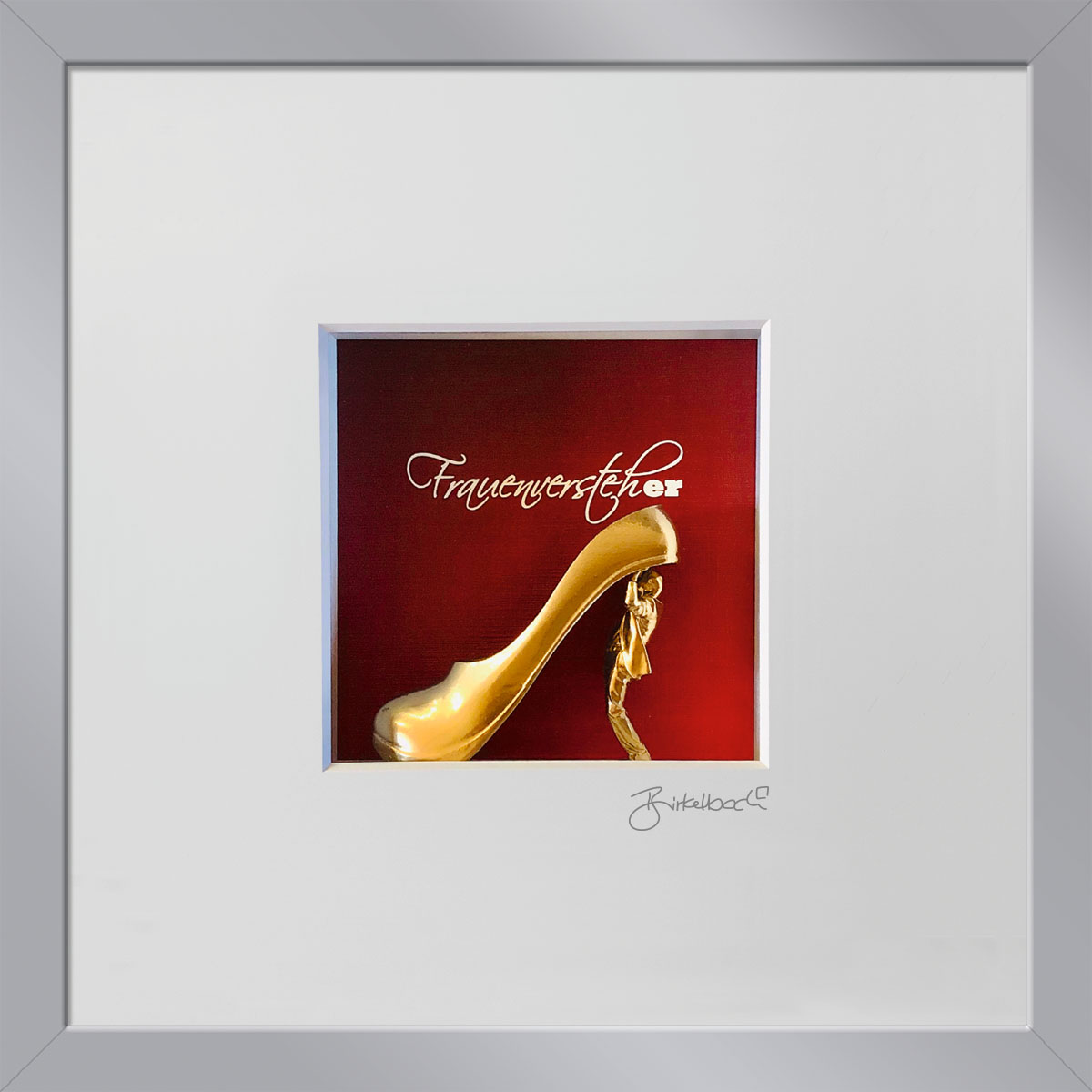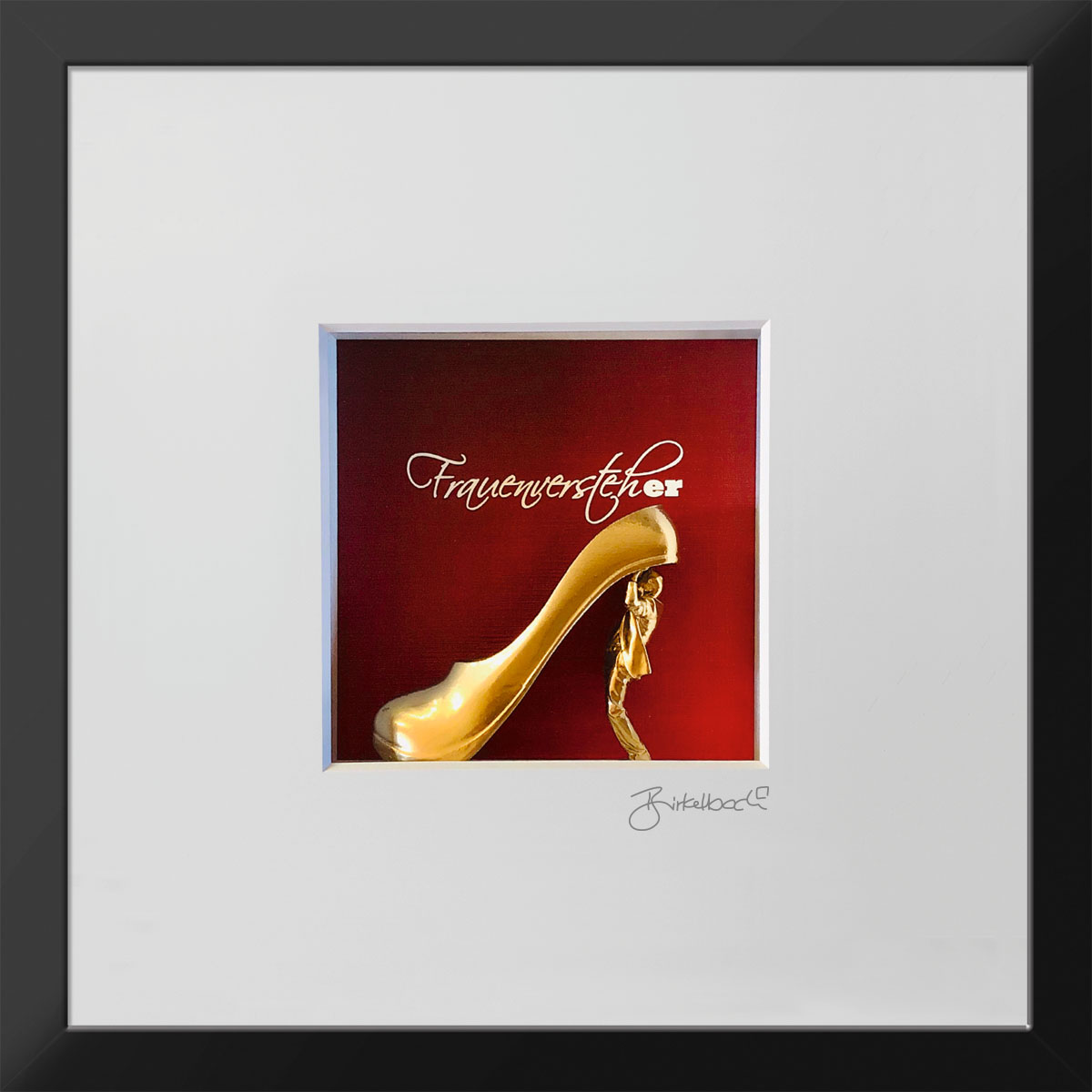 Frauenversteher – die gibt es nicht! Oder doch? Der Künstler hat jedenfalls eine klare Vorstellung, die den meisten Damen gefallen würde. Spätestens beim nächsten Einkauf der neuen Schuhe. Ein Objektbild, das die vernachlässigte Frau dem Göttergatten schenken sollte, um sich selbst eine Freude zu machen. Oder sie beschenkt sich selbst.