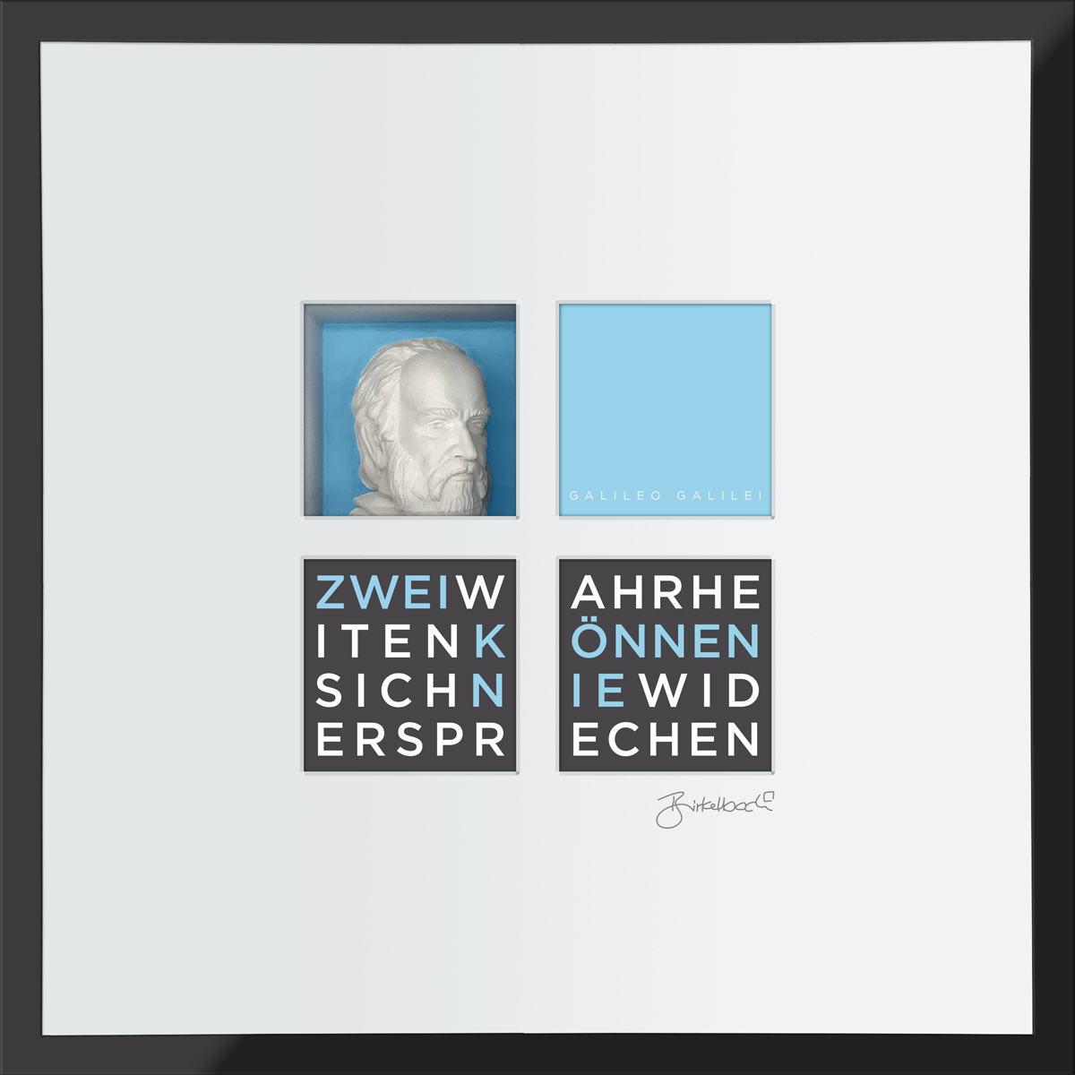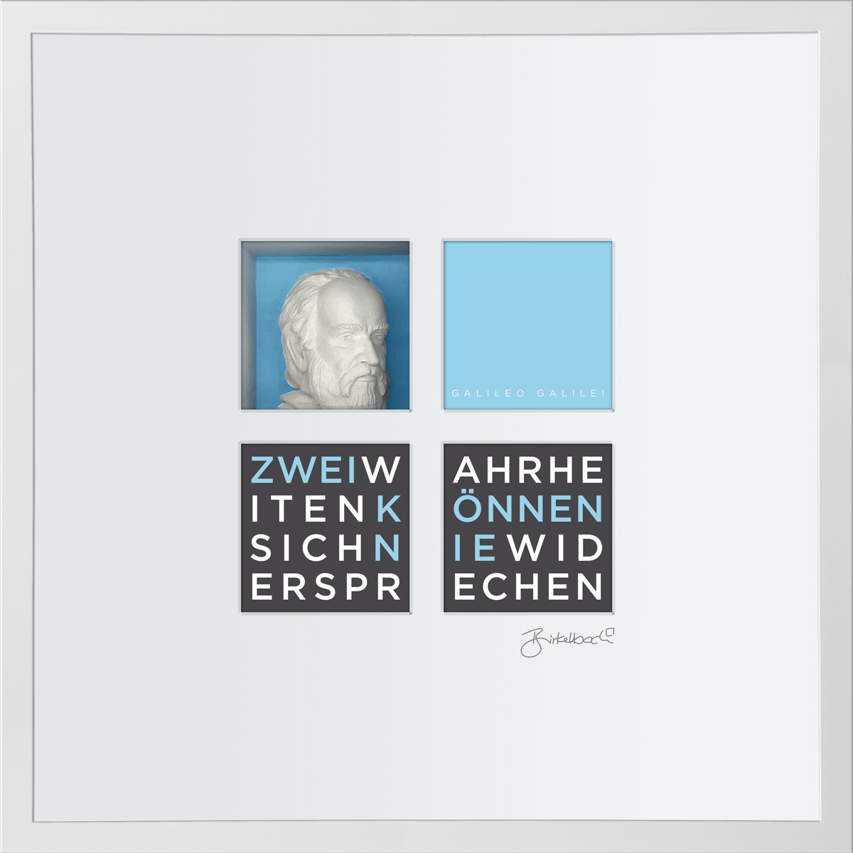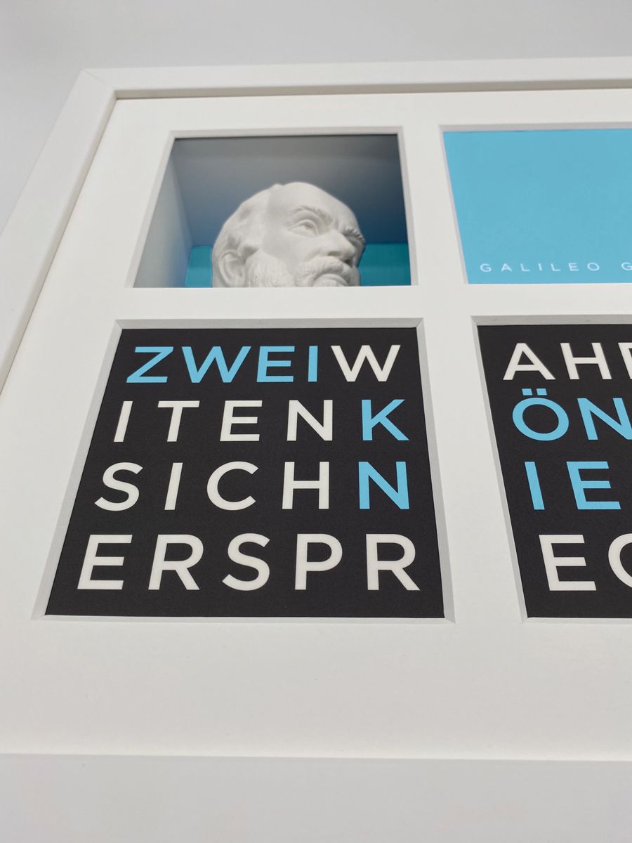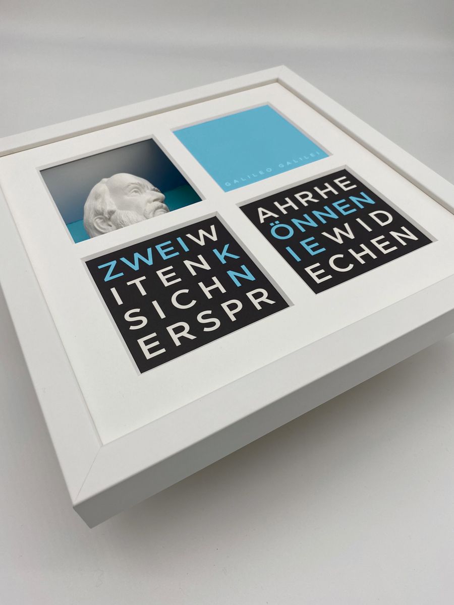 Die Exponate aus der Serie Büstenbilder bestehen im wesentlichen aus fünf Bestandteilen: einem Objektkasten mit eingesetzter 3D-Gipsbüste (1), einem aufgelegtem Digitalkarton (2), einem vierfach gestanztem Passpartout (3), einer blendfreien Verglasung (4) und einem hochwertigen Holz-Bilderrahmen (5). Die einzelnen Produktbestandteile werden kunsthandwerklich zusammengefügt nachdem die Büsten vor dem Einsetzen individuell geschliffen wurden. Daher können die Exponate leicht von der Darstellung im Katalog abweichen. Auf der Rückseite des Exponates ist ein Zertifikat angebracht, dass die Echtheit bestätigt und die Seriennummer ausweist. Es ist vom Künstler unterschrieben.