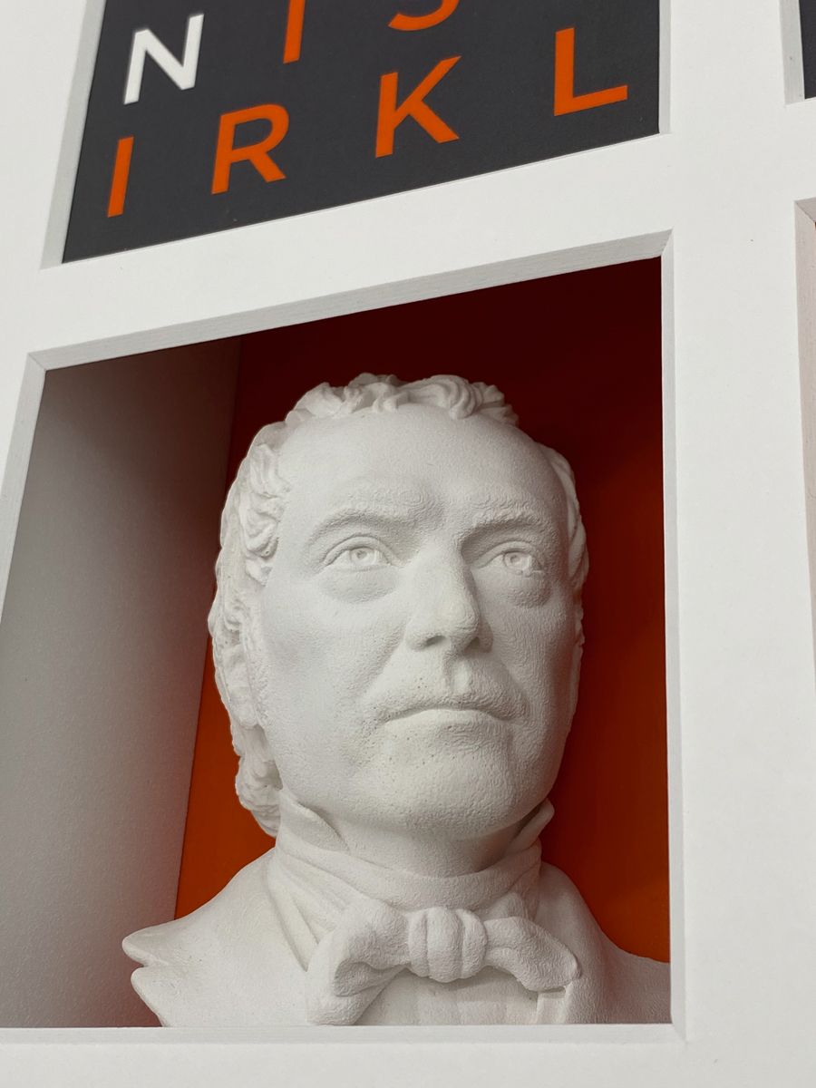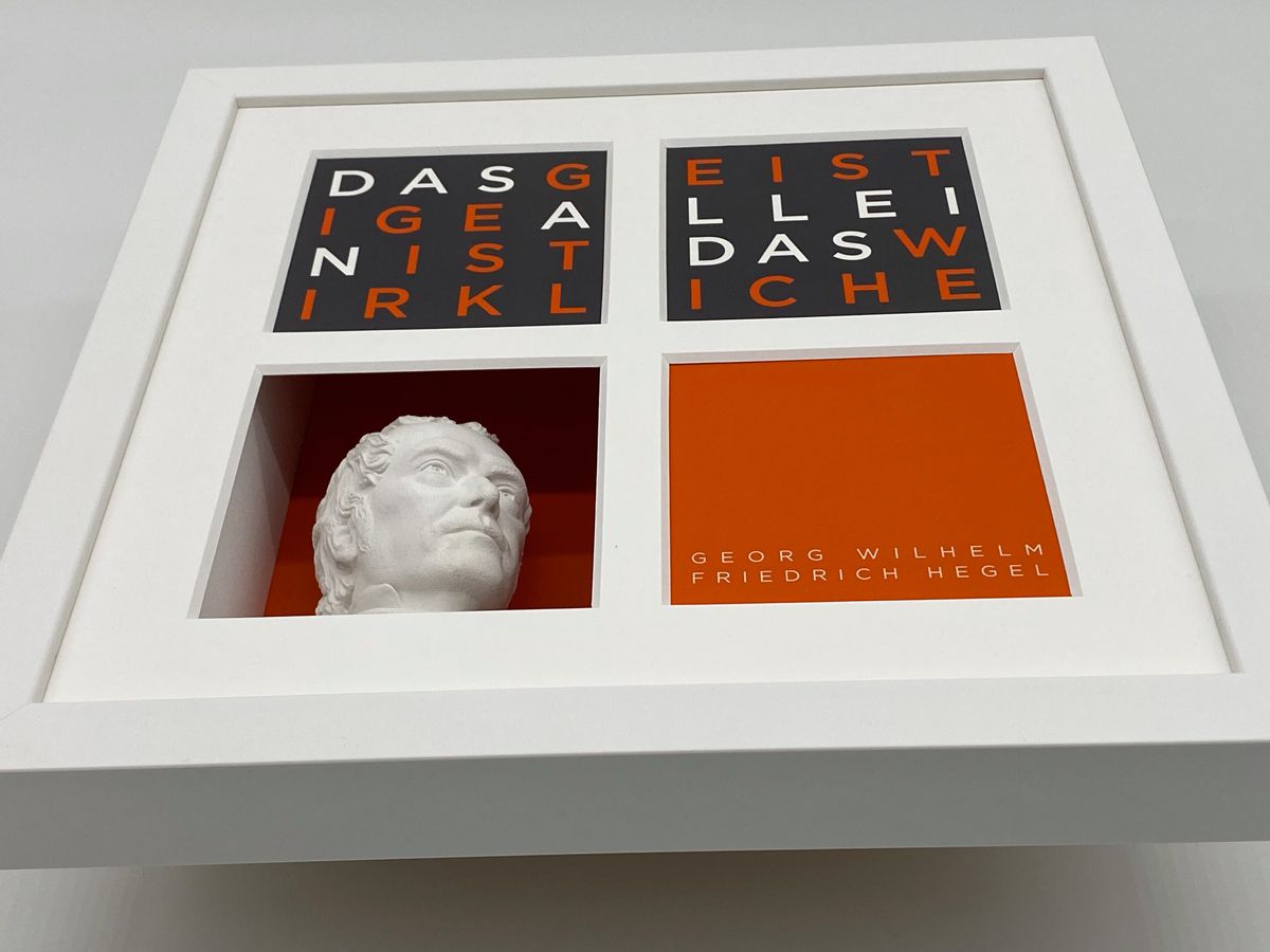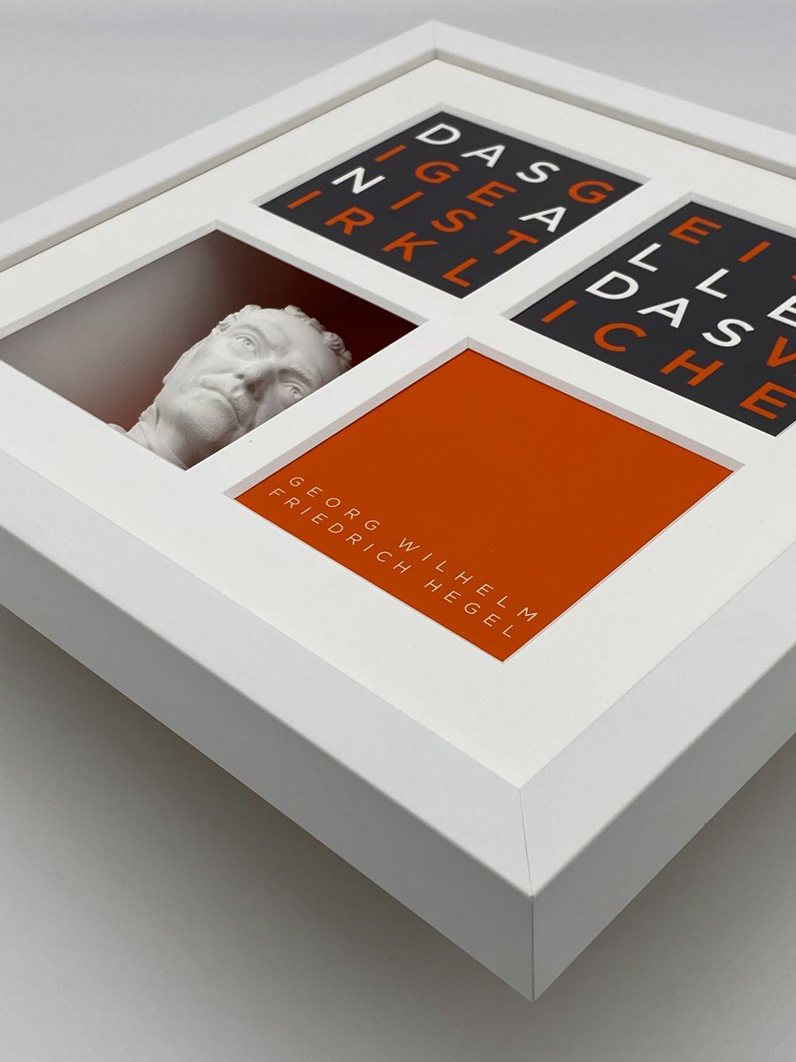Die Exponate aus der Serie Büstenbilder bestehen im wesentlichen aus fünf Bestandteilen: einem Objektkasten mit eingesetzter 3D-Gipsbüste (1), einem aufgelegtem Digitalkarton (2), einem vierfach gestanztem Passpartout (3), einer blendfreien Verglasung (4) und einem hochwertigen Holz-Bilderrahmen (5). Die einzelnen Produktbestandteile werden kunsthandwerklich zusammengefügt nachdem die Büsten vor dem Einsetzen individuell geschliffen wurden. Daher können die Exponate leicht von der Darstellung im Katalog abweichen. Auf der Rückseite des Exponates ist ein Zertifikat angebracht, dass die Echtheit bestätigt und die Seriennummer ausweist. Es ist vom Künstler unterschrieben.