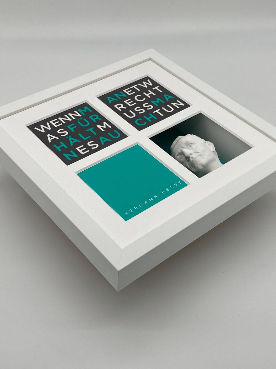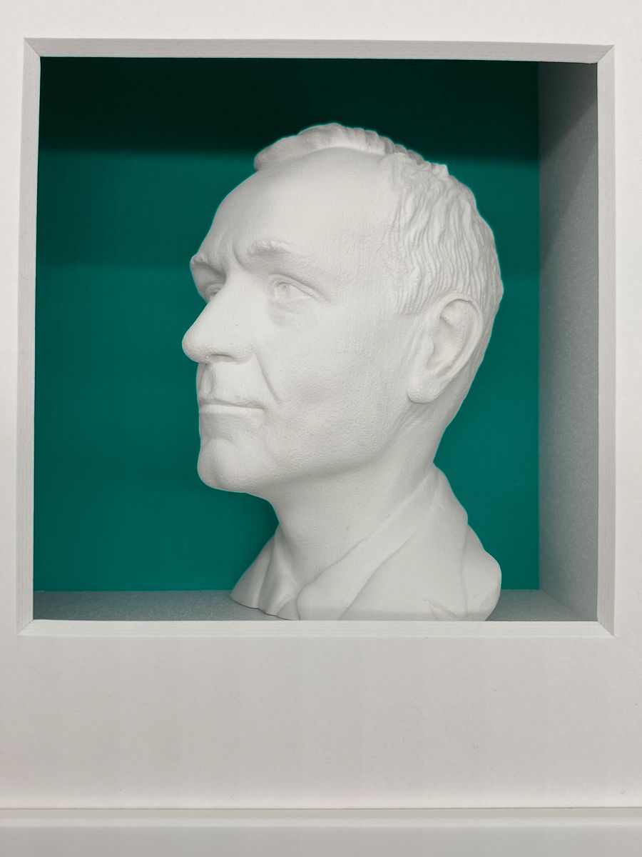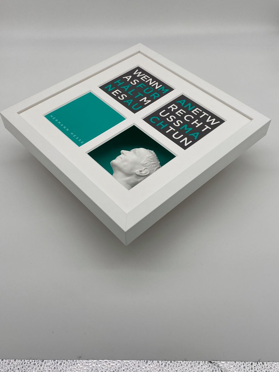 Die Exponate aus der Serie Büstenbilder bestehen im wesentlichen aus fünf Bestandteilen: einem Objektkasten mit eingesetzter 3D-Gipsbüste (1), einem aufgelegtem Digitalkarton (2), einem vierfach gestanztem Passpartout (3), einer blendfreien Verglasung (4) und einem hochwertigen Holz-Bilderrahmen (5). Die einzelnen Produktbestandteile werden kunsthandwerklich zusammengefügt nachdem die Büsten vor dem Einsetzen individuell geschliffen wurden. Daher können die Exponate leicht von der Darstellung im Katalog abweichen. Auf der Rückseite des Exponates ist ein Zertifikat angebracht, dass die Echtheit bestätigt und die Seriennummer ausweist. Es ist vom Künstler unterschrieben.