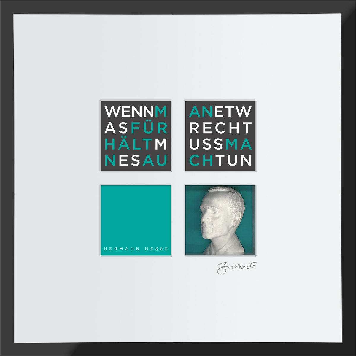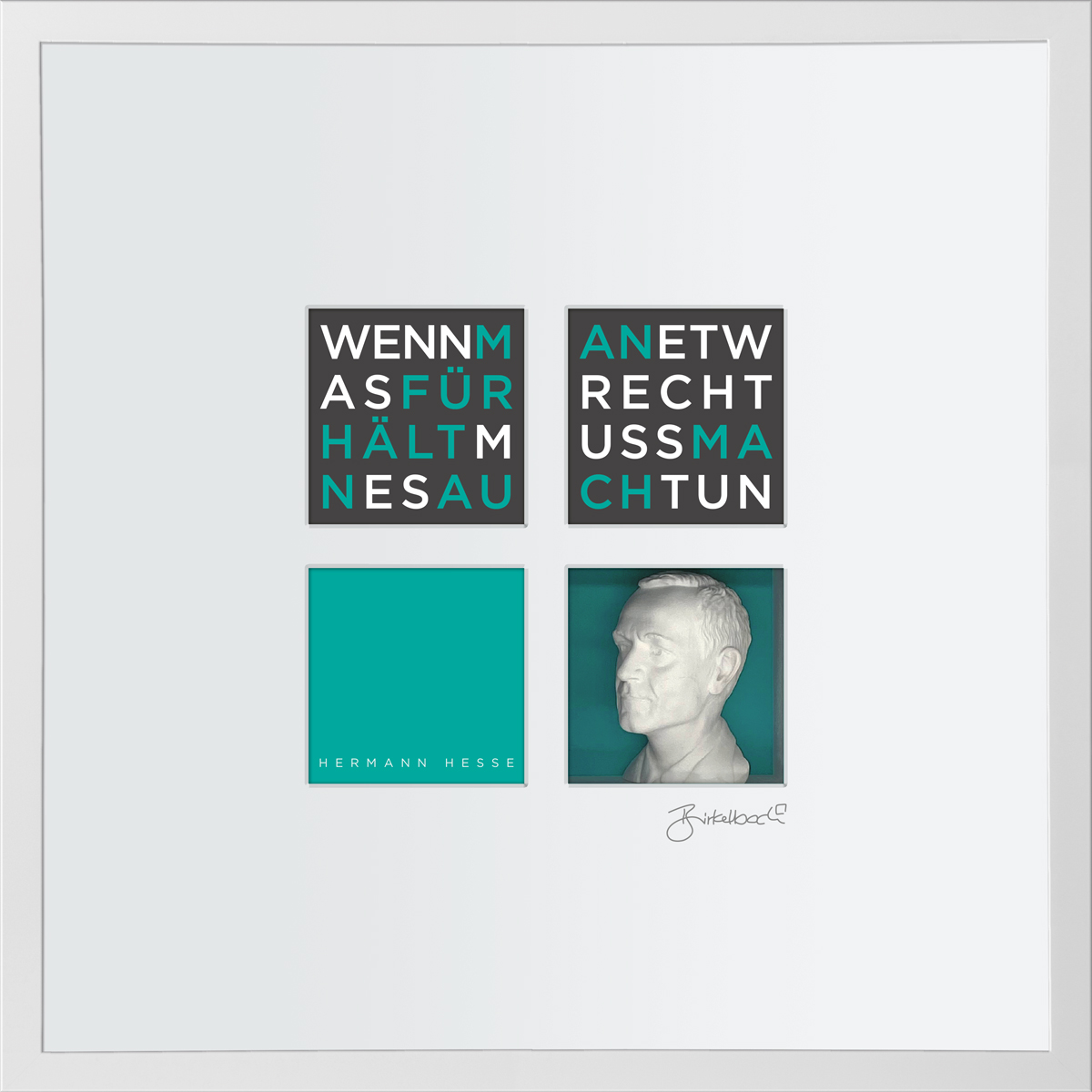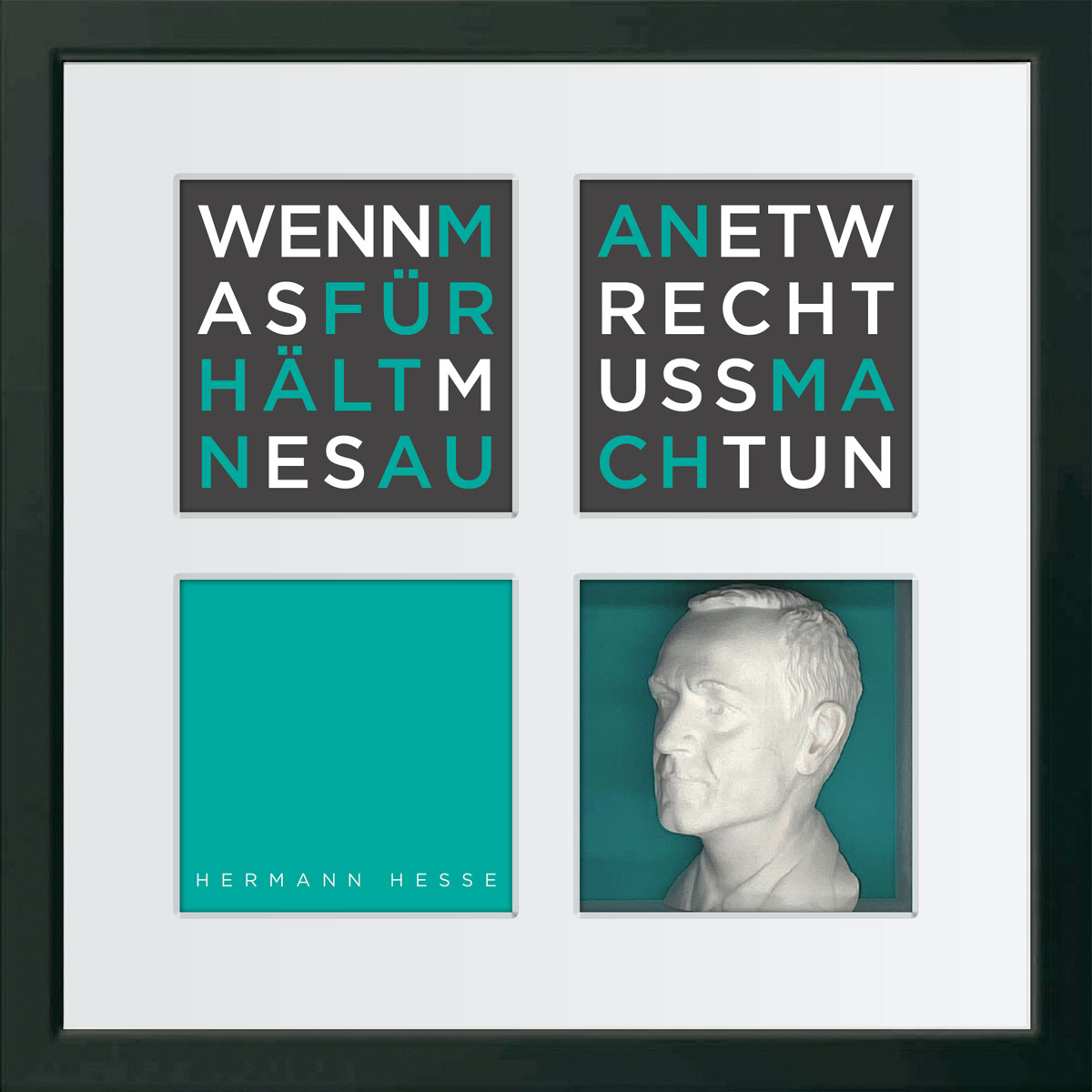 Die Exponate aus der Serie Büstenbilder bestehen im wesentlichen aus fünf Bestandteilen: einem Objektkasten mit eingesetzter 3D-Gipsbüste (1), einem aufgelegtem Digitalkarton (2), einem vierfach gestanztem Passpartout (3), einer blendfreien Verglasung (4) und einem hochwertigen Holz-Bilderrahmen (5). Die einzelnen Produktbestandteile werden kunsthandwerklich zusammengefügt nachdem die Büsten vor dem Einsetzen individuell geschliffen wurden. Daher können die Exponate leicht von der Darstellung im Katalog abweichen. Auf der Rückseite des Exponates ist ein Zertifikat angebracht, dass die Echtheit bestätigt und die Seriennummer ausweist. Es ist vom Künstler unterschrieben.