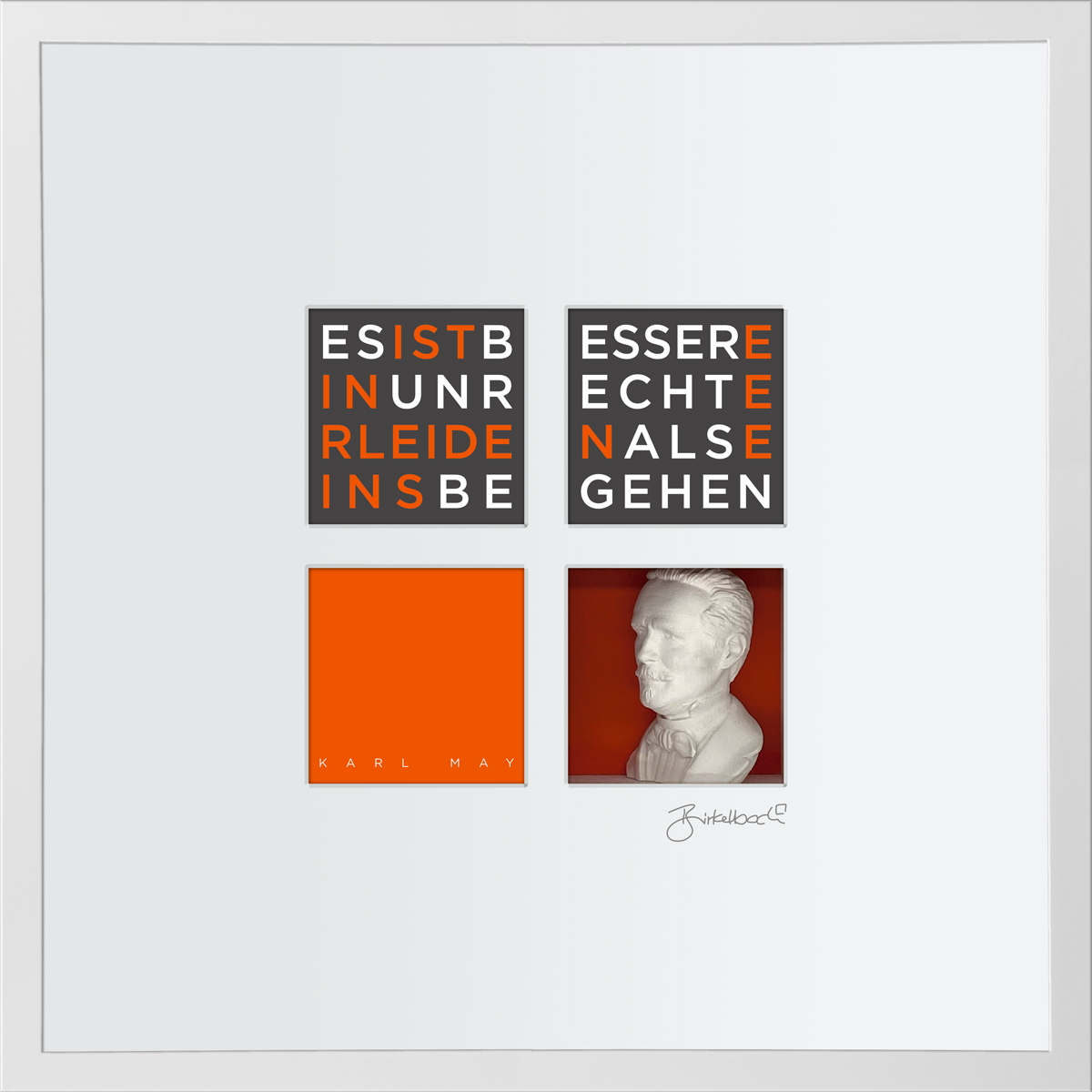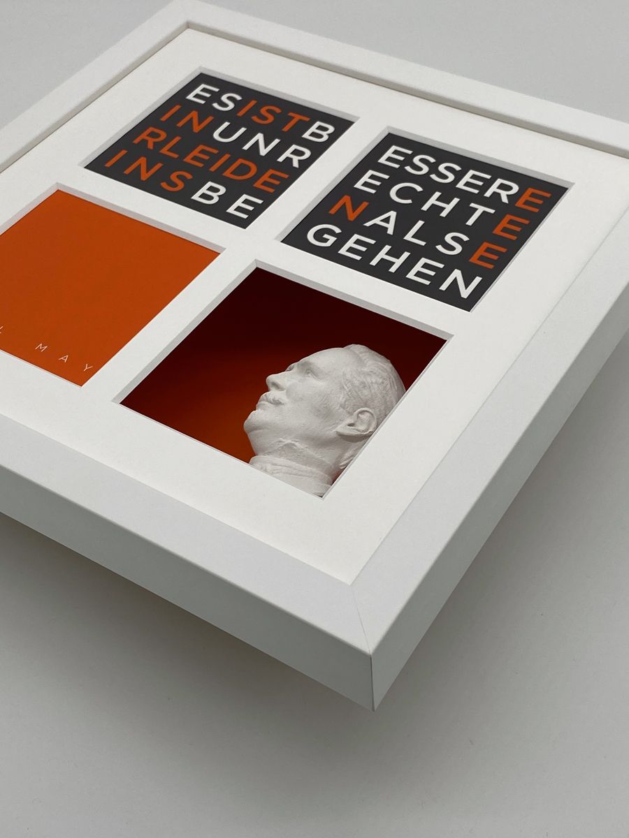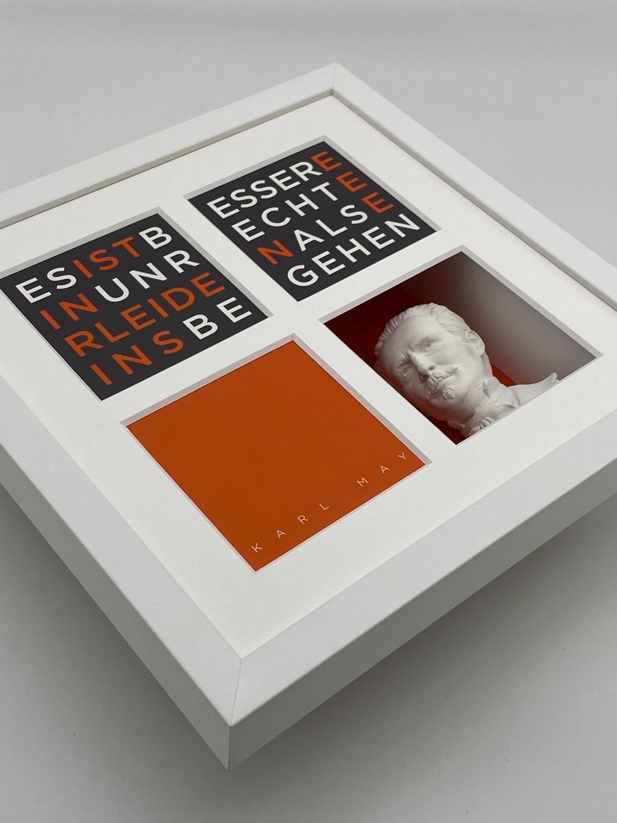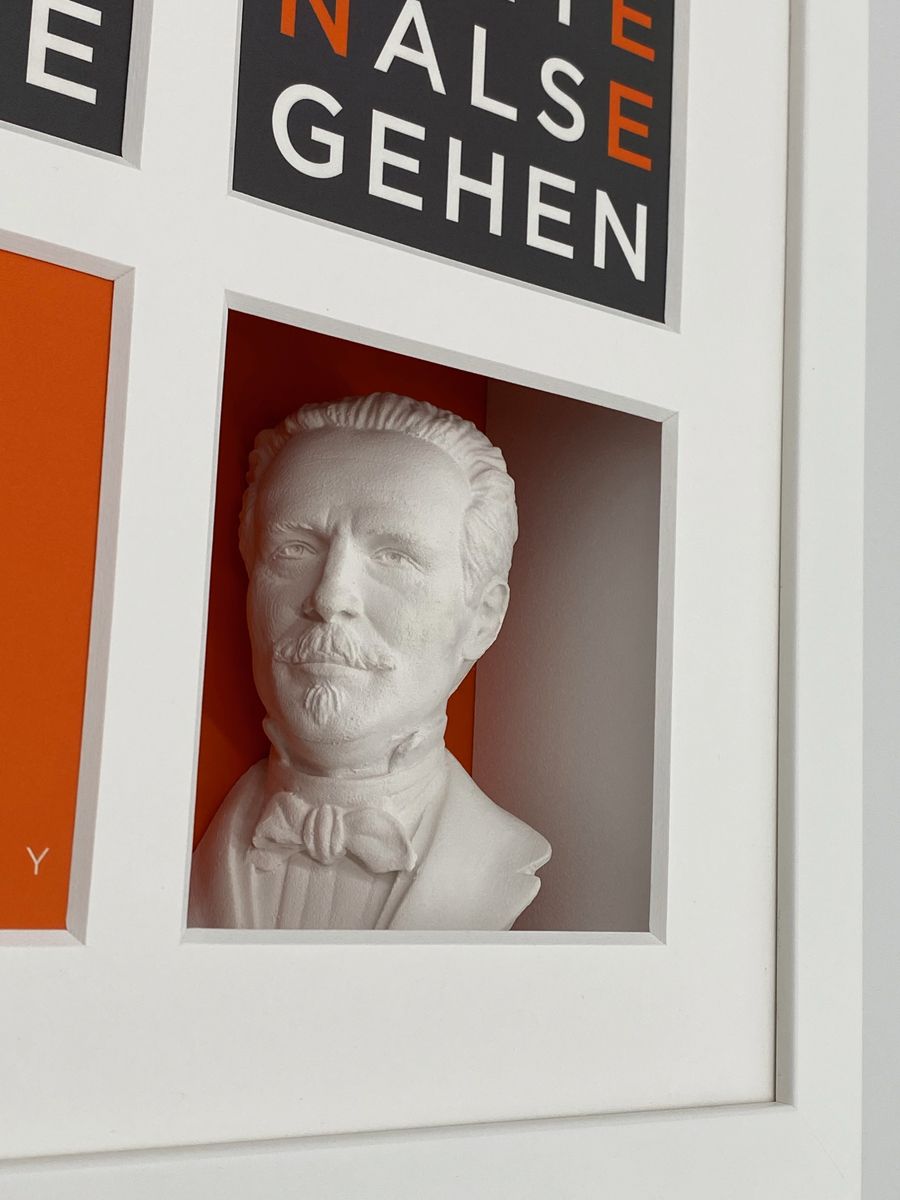 Die Exponate aus der Serie Büstenbilder bestehen im wesentlichen aus fünf Bestandteilen: einem Objektkasten mit eingesetzter 3D-Gipsbüste (1), einem aufgelegtem Digitalkarton (2), einem vierfach gestanztem Passpartout (3), einer blendfreien Verglasung (4) und einem hochwertigen Holz-Bilderrahmen (5). Die einzelnen Produktbestandteile werden kunsthandwerklich zusammengefügt nachdem die Büsten vor dem Einsetzen individuell geschliffen wurden. Daher können die Exponate leicht von der Darstellung im Katalog abweichen. Auf der Rückseite des Exponates ist ein Zertifikat angebracht, dass die Echtheit bestätigt und die Seriennummer ausweist. Es ist vom Künstler unterschrieben.