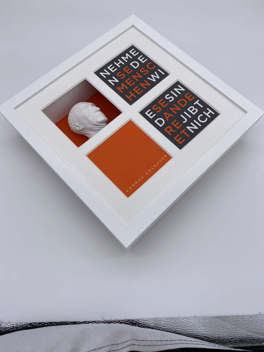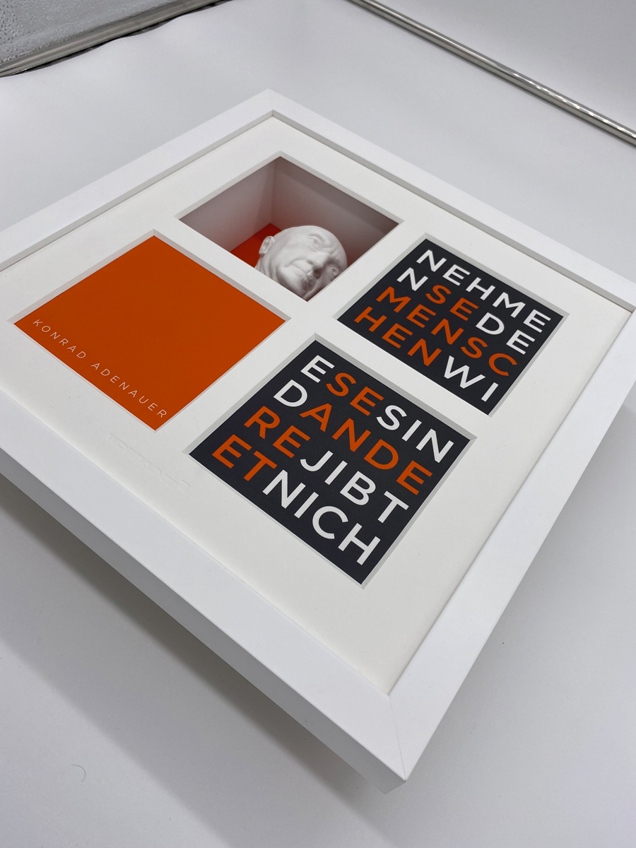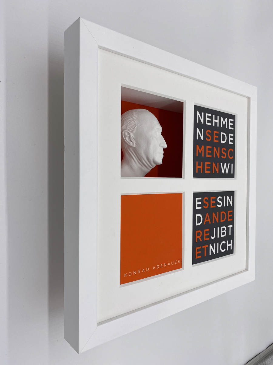 Die Exponate aus der Serie Büstenbilder bestehen im wesentlichen aus fünf Bestandteilen: einem Objektkasten mit eingesetzter 3D-Gipsbüste (1), einem aufgelegtem Digitalkarton (2), einem vierfach gestanztem Passpartout (3), einer blendfreien Verglasung (4) und einem hochwertigen Holz-Bilderrahmen (5). Die einzelnen Produktbestandteile werden kunsthandwerklich zusammengefügt nachdem die Büsten vor dem Einsetzen individuell geschliffen wurden. Daher können die Exponate leicht von der Darstellung im Katalog abweichen. Auf der Rückseite des Exponates ist ein Zertifikat angebracht, dass die Echtheit bestätigt und die Seriennummer ausweist. Es ist vom Künstler unterschrieben.