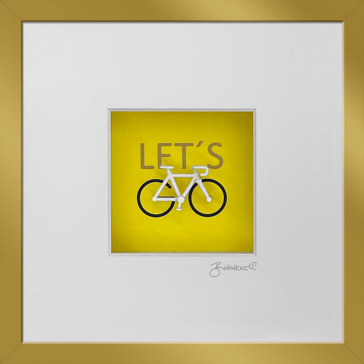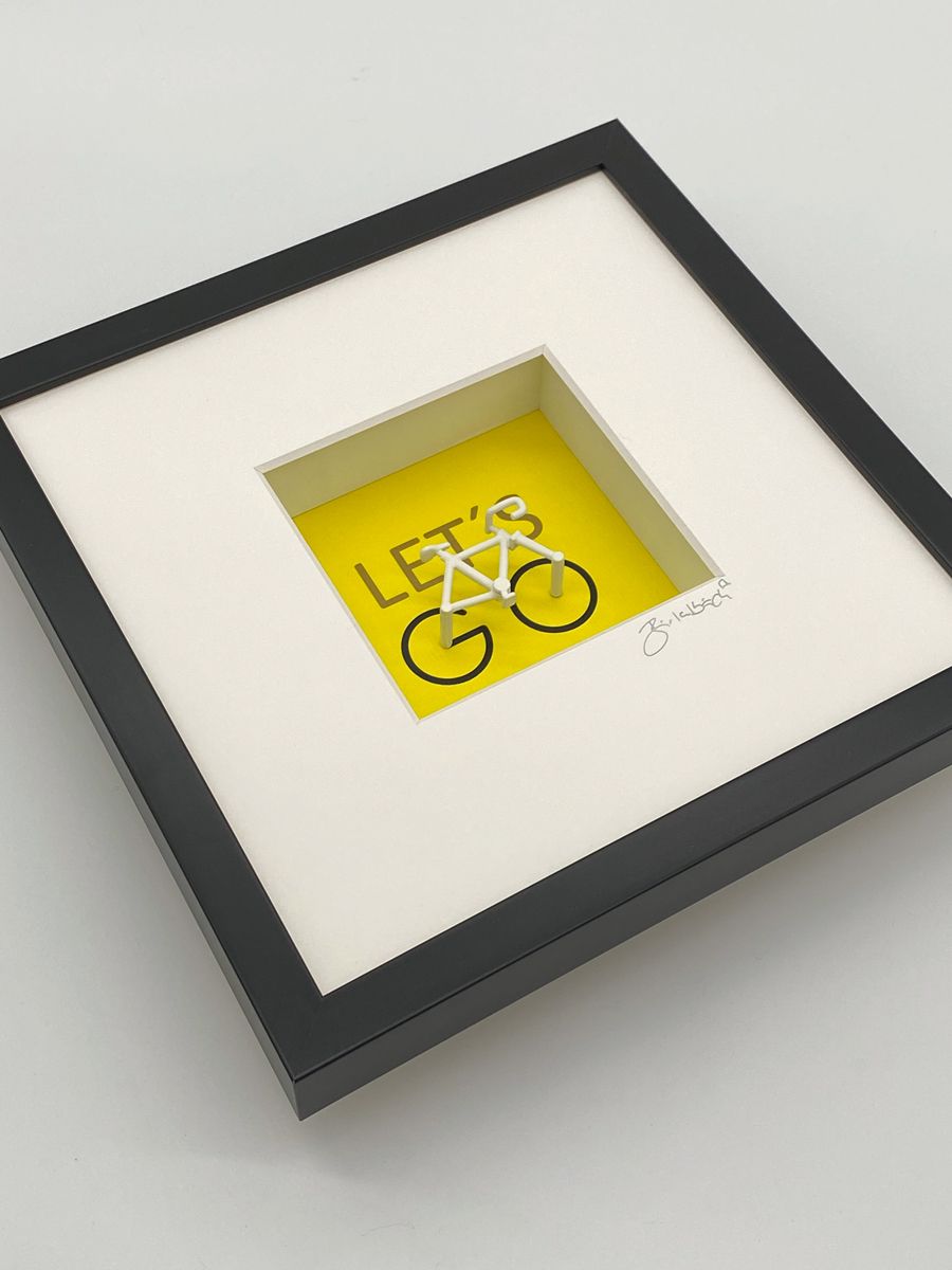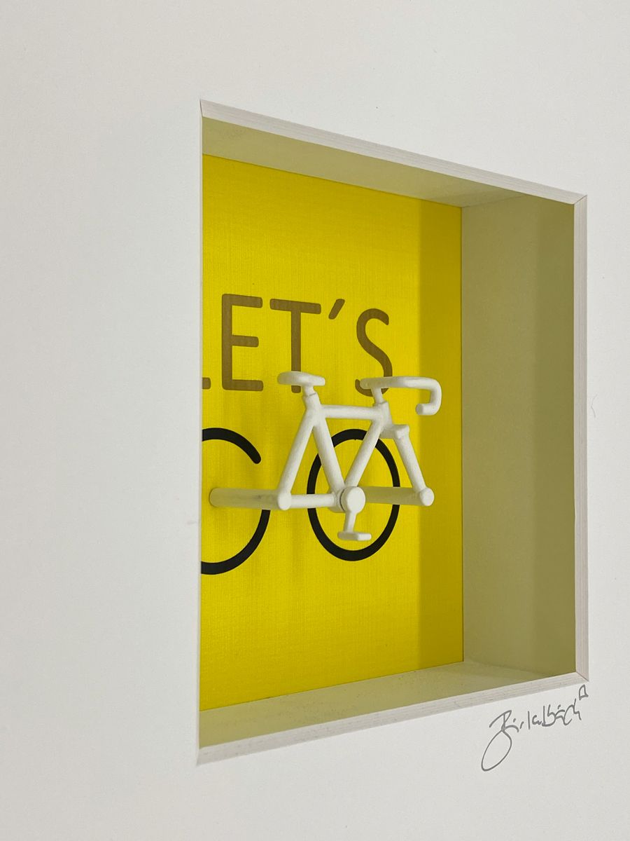 Endlich mal wieder auf das Rad steigen und los geht es! Ein Geschenk für alle RadsportlerInnen, die auch im Arbeitszimmer oder ihrem Office an diesen schönen Sport denken wollen und sollen. Der Fahrradrahmen als 3D-Element in typischem Racing-Gelb.