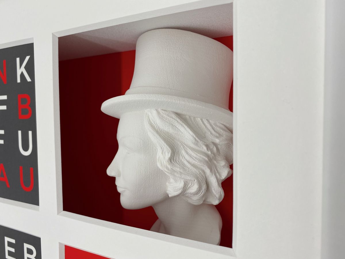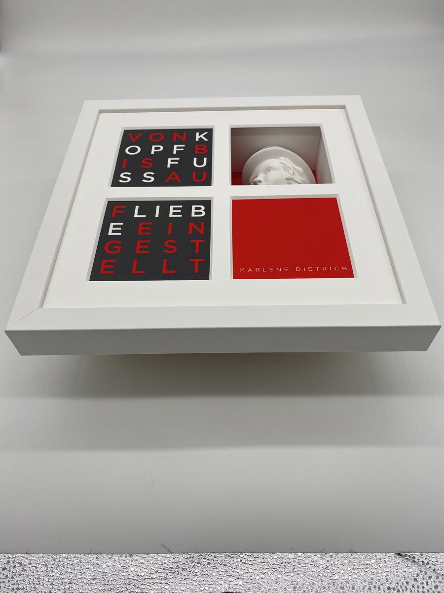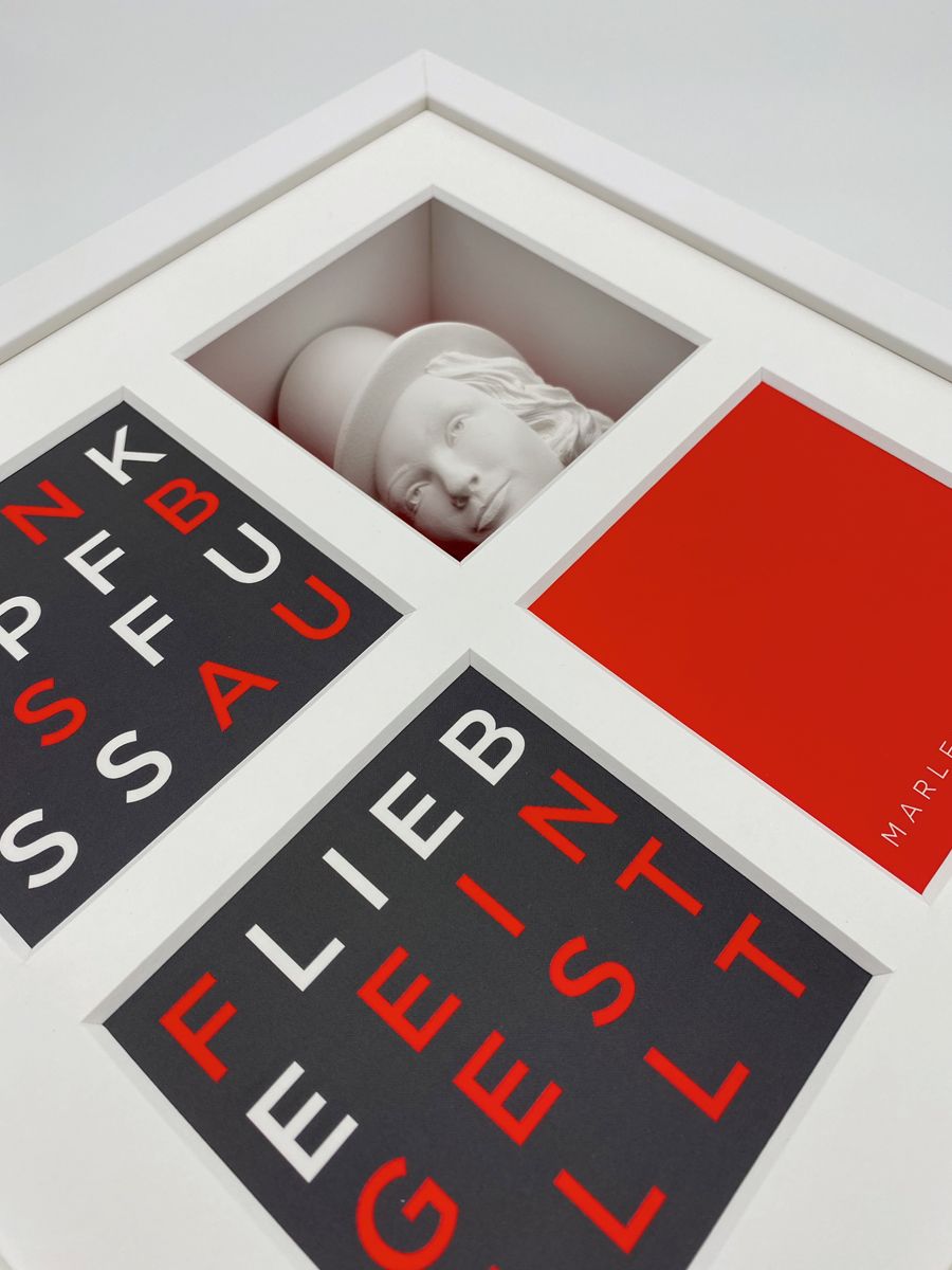 Die Exponate aus der Serie Büstenbilder bestehen im wesentlichen aus fünf Bestandteilen: einem Objektkasten mit eingesetzter 3D-Gipsbüste (1), einem aufgelegtem Digitalkarton (2), einem vierfach gestanztem Passpartout (3), einer blendfreien Verglasung (4) und einem hochwertigen Holz-Bilderrahmen (5). Die einzelnen Produktbestandteile werden kunsthandwerklich zusammengefügt nachdem die Büsten vor dem Einsetzen individuell geschliffen wurden. Daher können die Exponate leicht von der Darstellung im Katalog abweichen. Auf der Rückseite des Exponates ist ein Zertifikat angebracht, dass die Echtheit bestätigt und die Seriennummer ausweist. Es ist vom Künstler unterschrieben.