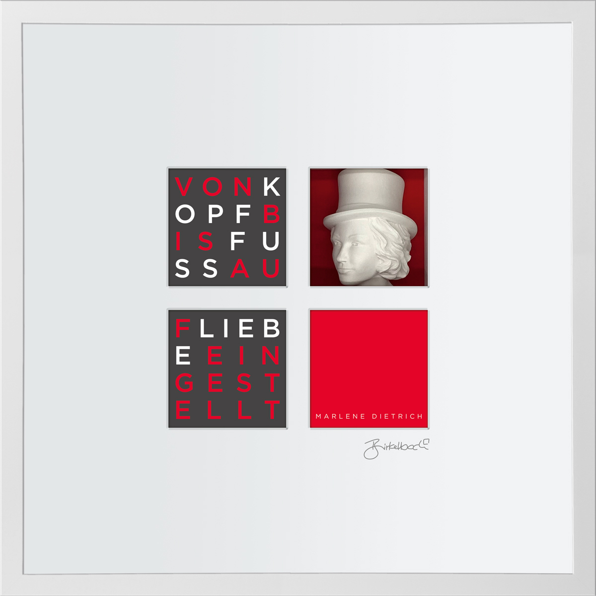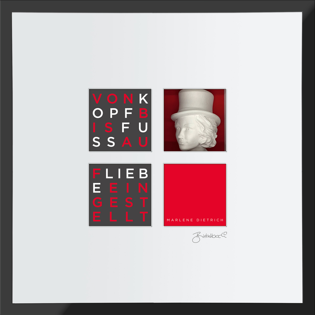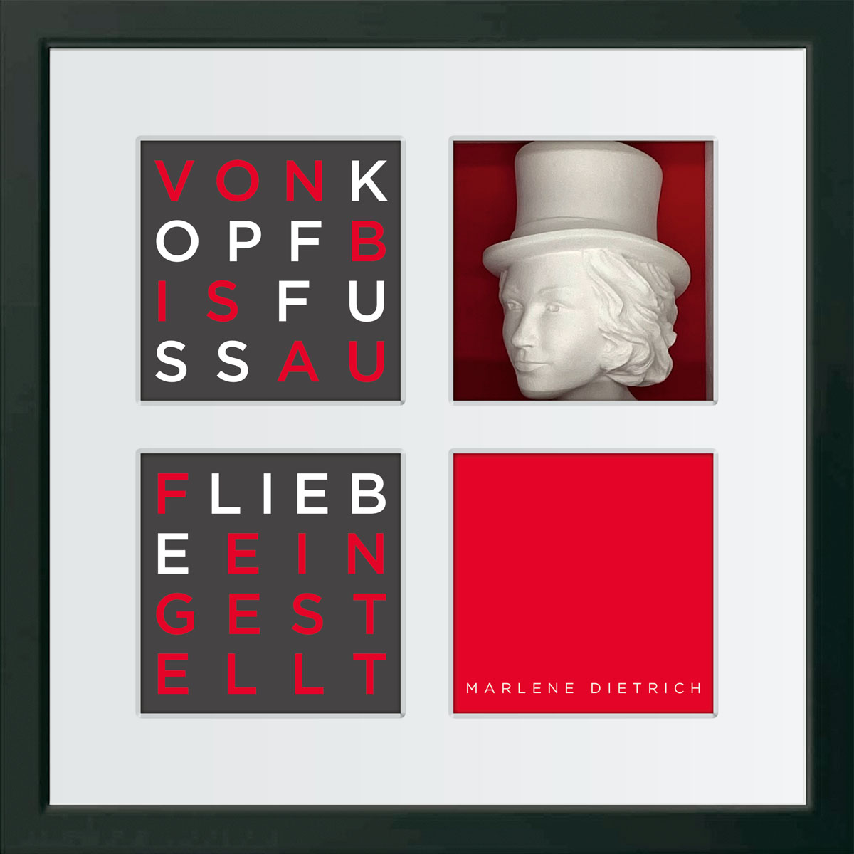 Die Exponate aus der Serie Büstenbilder bestehen im wesentlichen aus fünf Bestandteilen: einem Objektkasten mit eingesetzter 3D-Gipsbüste (1), einem aufgelegtem Digitalkarton (2), einem vierfach gestanztem Passpartout (3), einer blendfreien Verglasung (4) und einem hochwertigen Holz-Bilderrahmen (5). Die einzelnen Produktbestandteile werden kunsthandwerklich zusammengefügt nachdem die Büsten vor dem Einsetzen individuell geschliffen wurden. Daher können die Exponate leicht von der Darstellung im Katalog abweichen. Auf der Rückseite des Exponates ist ein Zertifikat angebracht, dass die Echtheit bestätigt und die Seriennummer ausweist. Es ist vom Künstler unterschrieben.