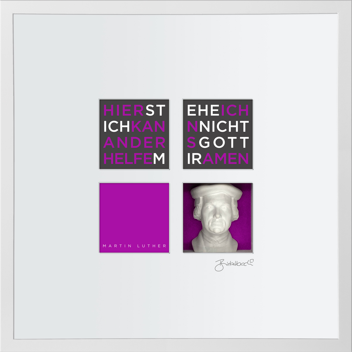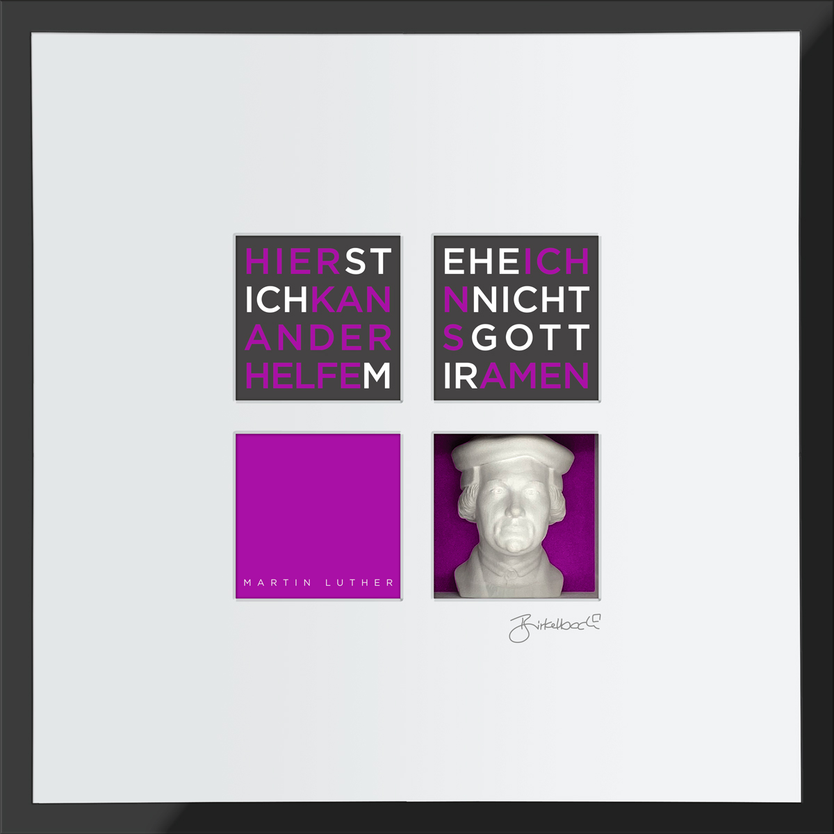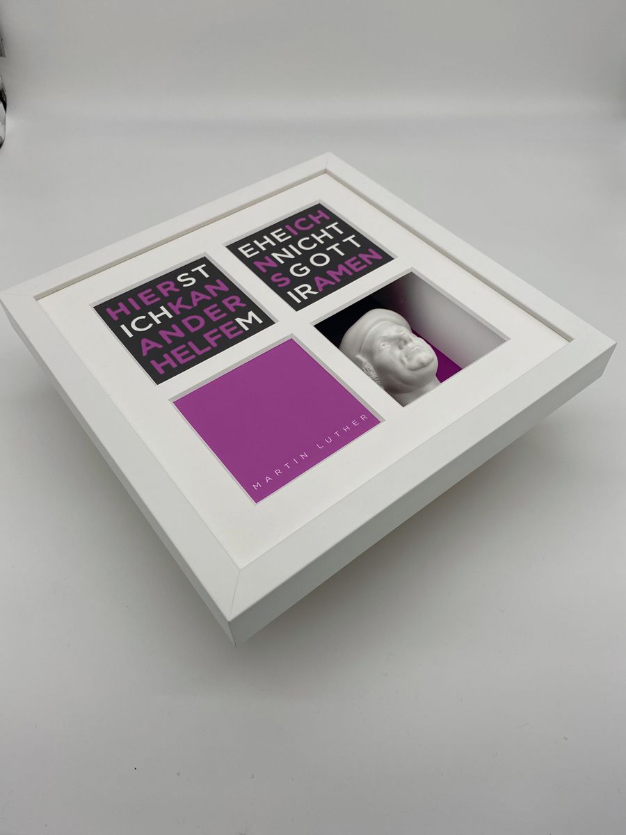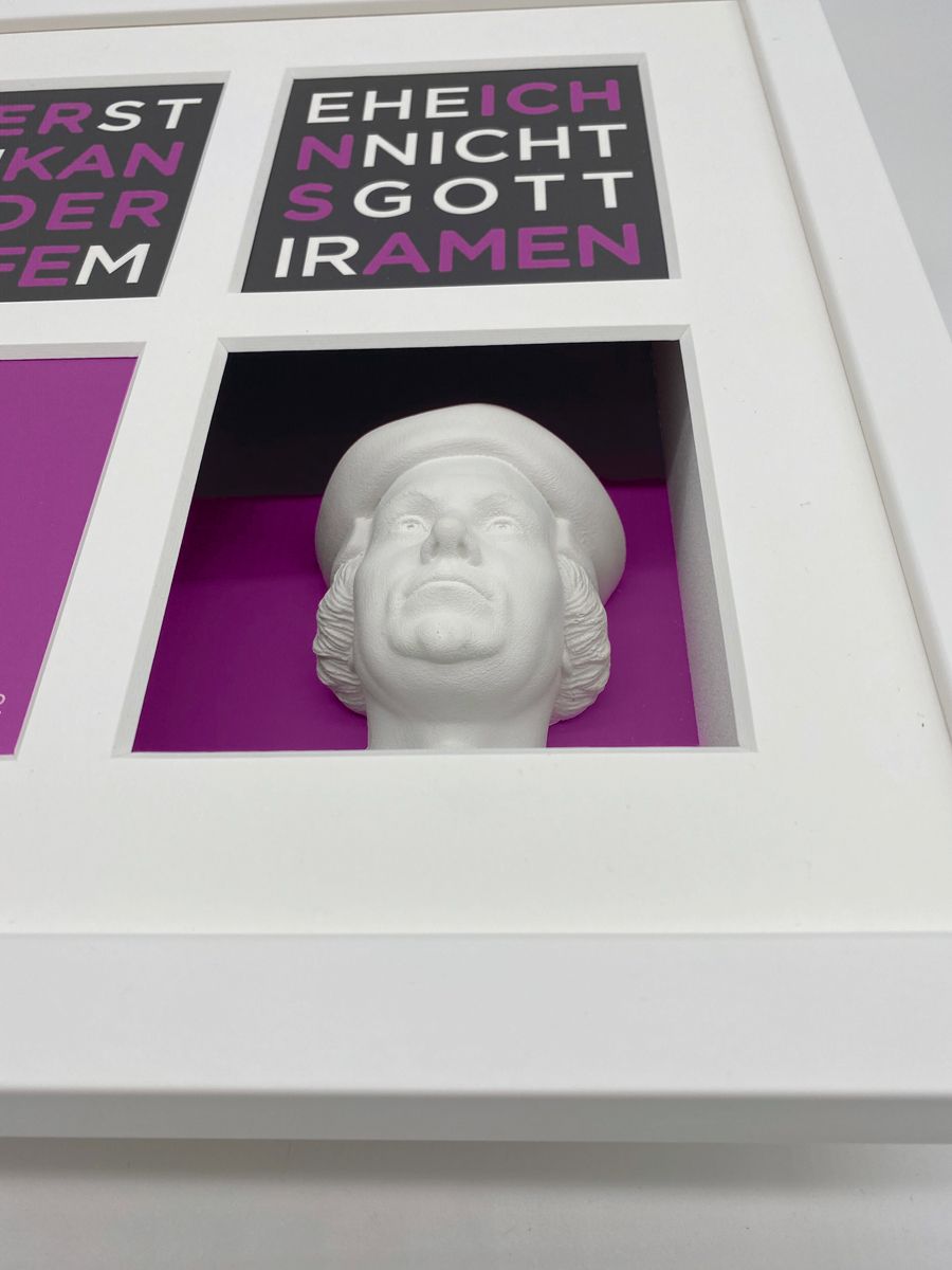 Die Exponate aus der Serie Büstenbilder bestehen im wesentlichen aus fünf Bestandteilen: einem Objektkasten mit eingesetzter 3D-Gipsbüste (1), einem aufgelegtem Digitalkarton (2), einem vierfach gestanztem Passpartout (3), einer blendfreien Verglasung (4) und einem hochwertigen Holz-Bilderrahmen (5). Die einzelnen Produktbestandteile werden kunsthandwerklich zusammengefügt nachdem die Büsten vor dem Einsetzen individuell geschliffen wurden. Daher können die Exponate leicht von der Darstellung im Katalog abweichen. Auf der Rückseite des Exponates ist ein Zertifikat angebracht, dass die Echtheit bestätigt und die Seriennummer ausweist. Es ist vom Künstler unterschrieben.