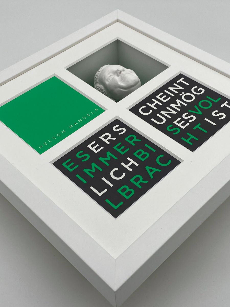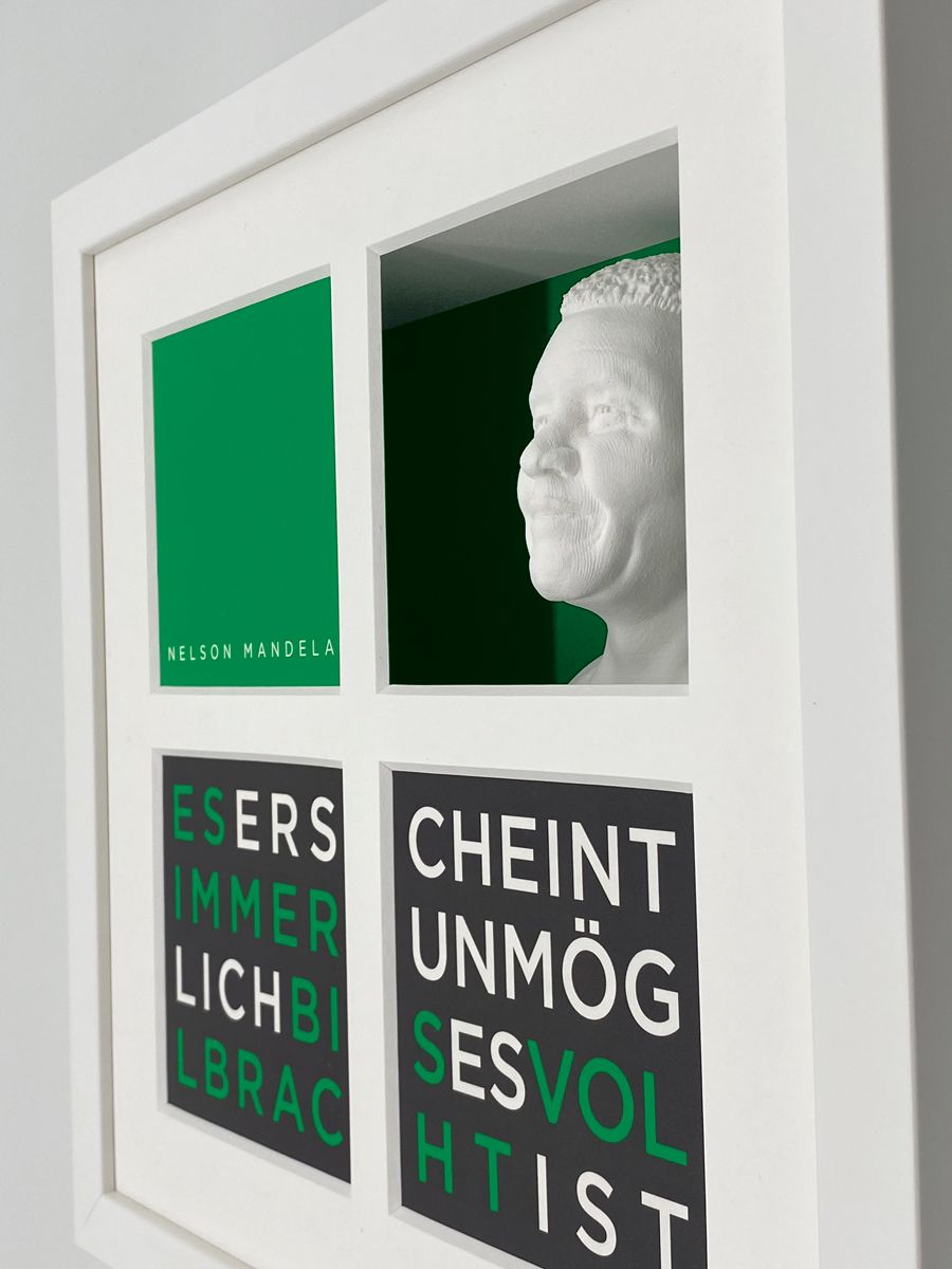 Die Exponate aus der Serie Büstenbilder bestehen im wesentlichen aus fünf Bestandteilen: einem Objektkasten mit eingesetzter 3D-Gipsbüste (1), einem aufgelegtem Digitalkarton (2), einem vierfach gestanztem Passpartout (3), einer blendfreien Verglasung (4) und einem hochwertigen Holz-Bilderrahmen (5). Die einzelnen Produktbestandteile werden kunsthandwerklich zusammengefügt nachdem die Büsten vor dem Einsetzen individuell geschliffen wurden. Daher können die Exponate leicht von der Darstellung im Katalog abweichen. Auf der Rückseite des Exponates ist ein Zertifikat angebracht, dass die Echtheit bestätigt und die Seriennummer ausweist. Es ist vom Künstler unterschrieben.