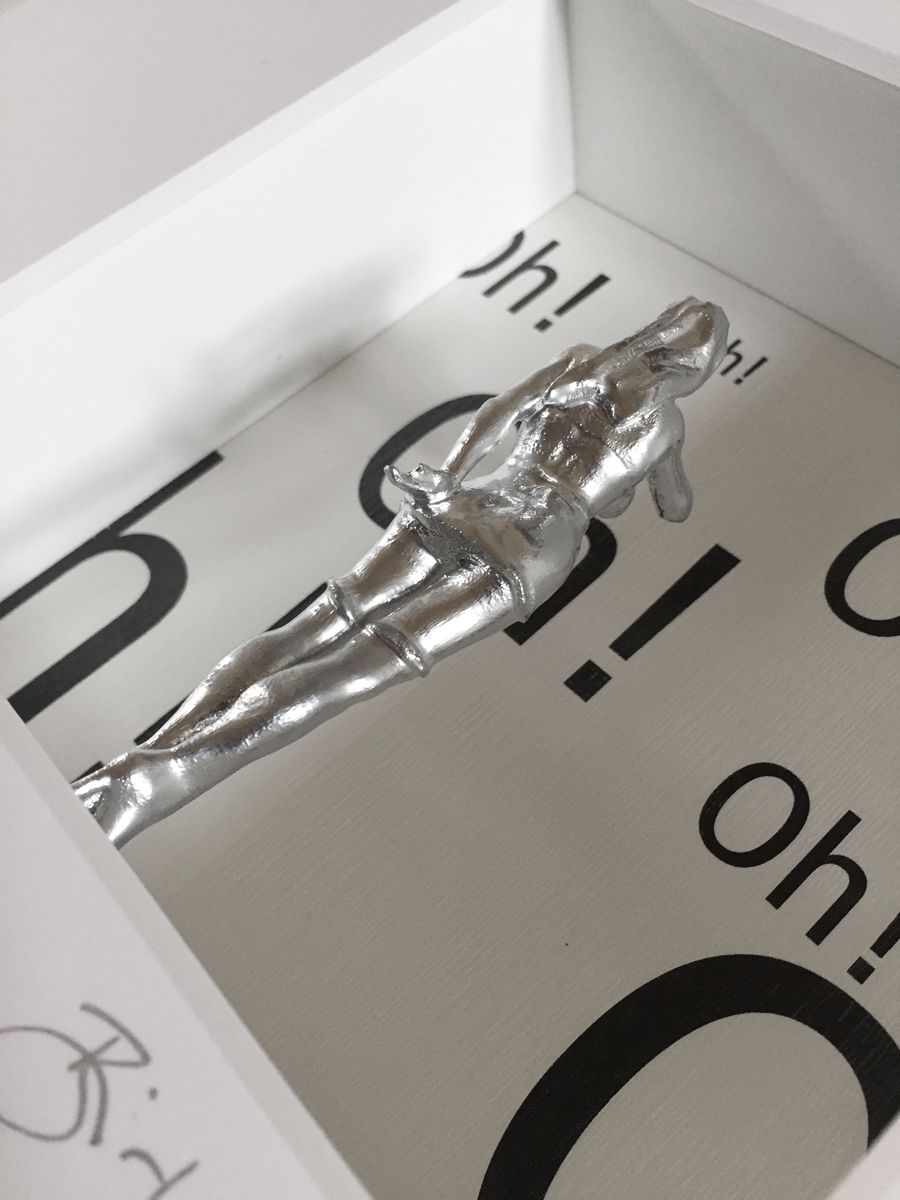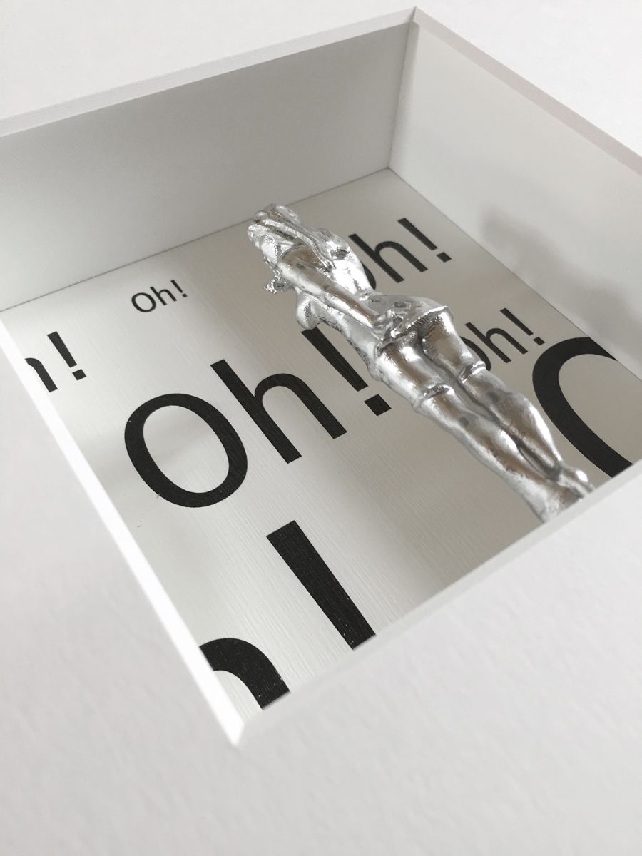 Die Exponate aus der Serie „Schöne Momente“ bestehen im wesentlichen aus fünf Bestandteilen: einem Objektkasten mit Hintergrundplatte aus Leinen-Kappa (1), einem dreidimensionalem Objektgegenstand (2), einem aufgeklebtem Passpartout (3) und einer Abdeckung durch eine fast blendfreie Verglasung (4) sowie einem hochwertigem Holz-Bilderrahmen (5). Die 3D-Objektgegenstände werden von Designern und CAD-Spezialisten nach Vorgabe entwickelt und mit modernsten 3D-Druckern erzeugt bzw. gefräst oder laser-gecutttet. Weitere dreidimensionale Gestaltungselemente ergänzen die Wort-Bild-Collagen. Die einzelnen Produktbestandteile werden kunsthandwerklich zusammengefügt und können daher leicht von der Darstellung im Katalog abweichen. Auf der Rückseite des Exponates ist ein Zertifikat angebracht, dass die Echtheit bestätigt und die Seriennummer ausweist. Es ist vom Künstler unterschrieben.