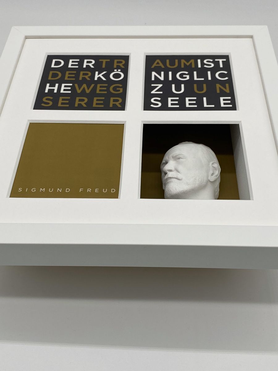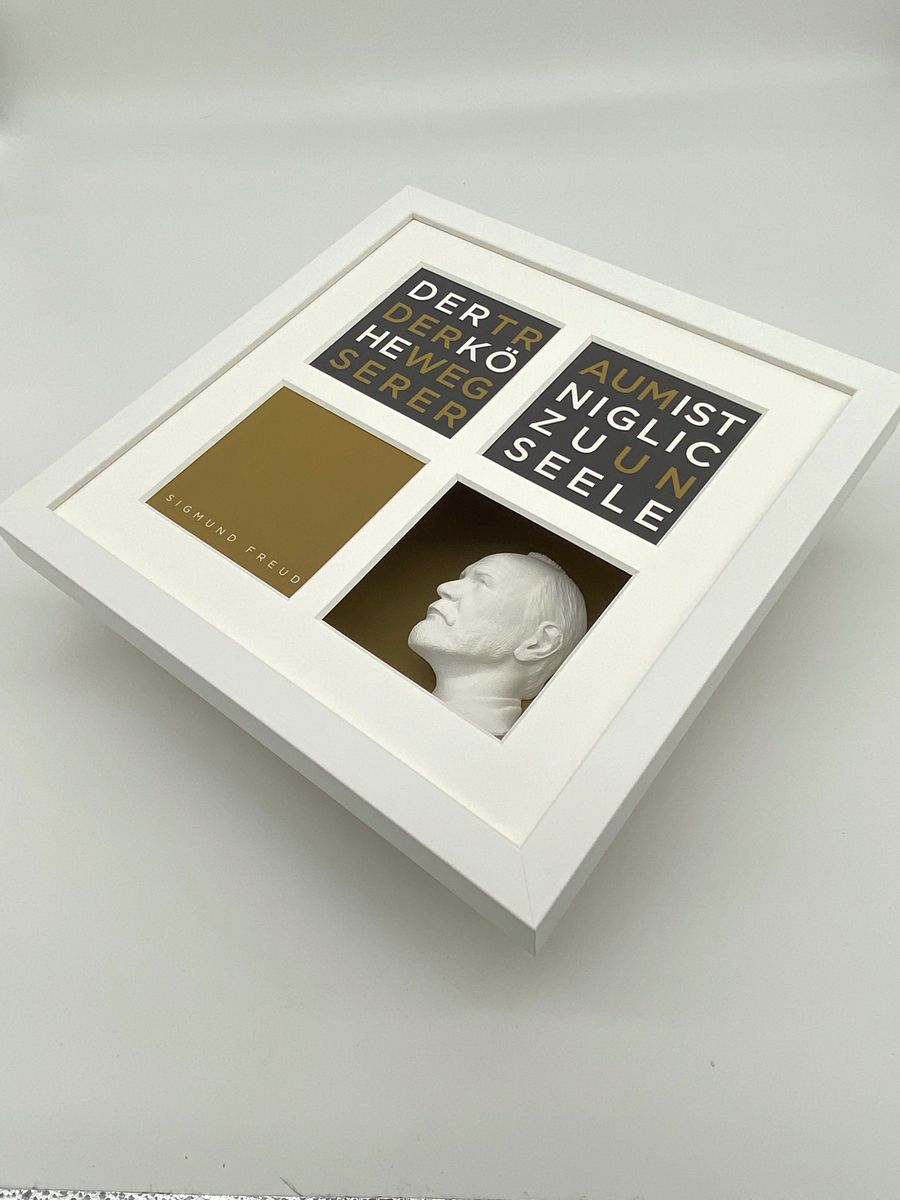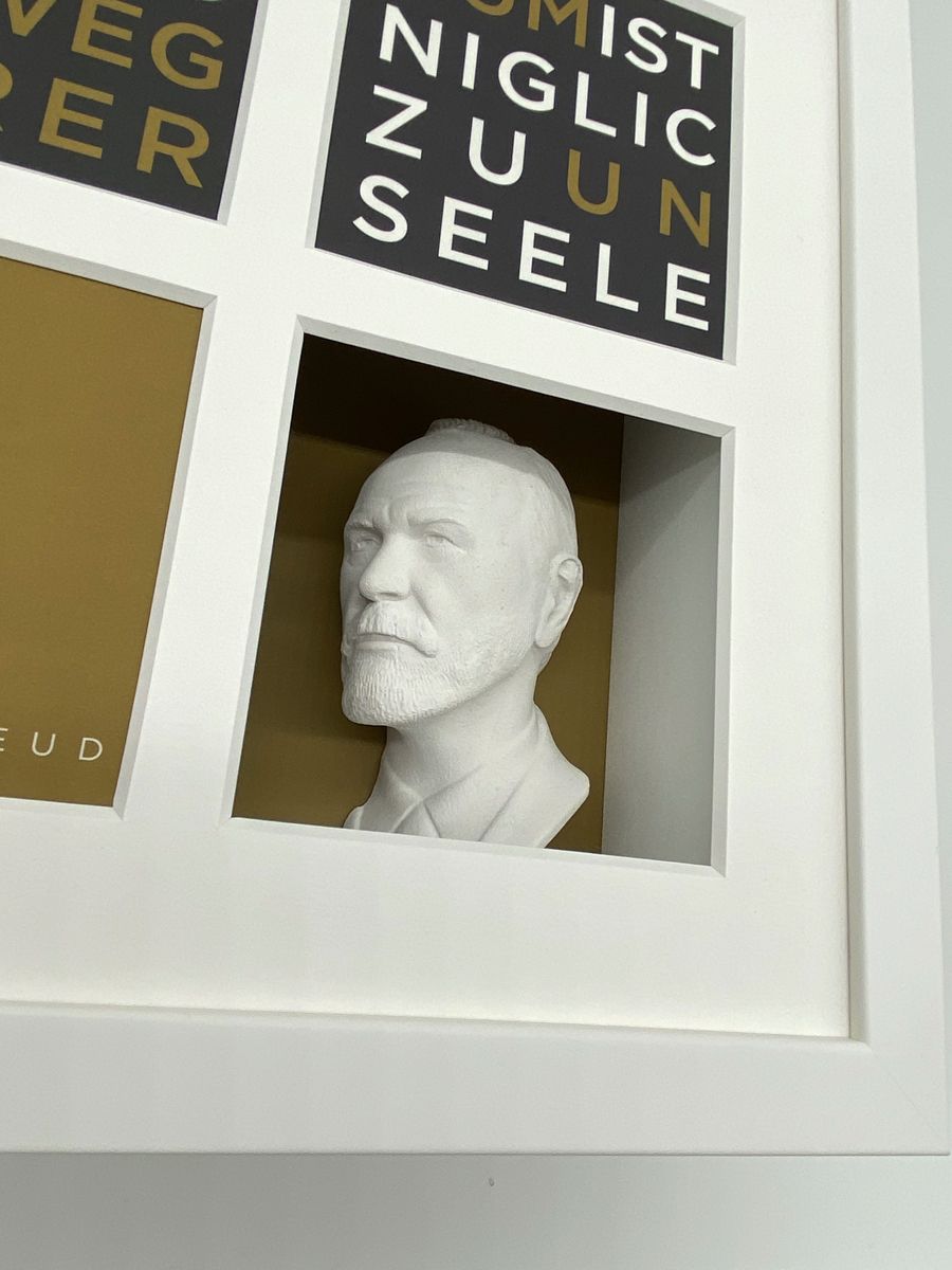 Die Exponate aus der Serie Büstenbilder bestehen im wesentlichen aus fünf Bestandteilen: einem Objektkasten mit eingesetzter 3D-Gipsbüste (1), einem aufgelegtem Digitalkarton (2), einem vierfach gestanztem Passpartout (3), einer blendfreien Verglasung (4) und einem hochwertigen Holz-Bilderrahmen (5). Die einzelnen Produktbestandteile werden kunsthandwerklich zusammengefügt nachdem die Büsten vor dem Einsetzen individuell geschliffen wurden. Daher können die Exponate leicht von der Darstellung im Katalog abweichen. Auf der Rückseite des Exponates ist ein Zertifikat angebracht, dass die Echtheit bestätigt und die Seriennummer ausweist. Es ist vom Künstler unterschrieben.