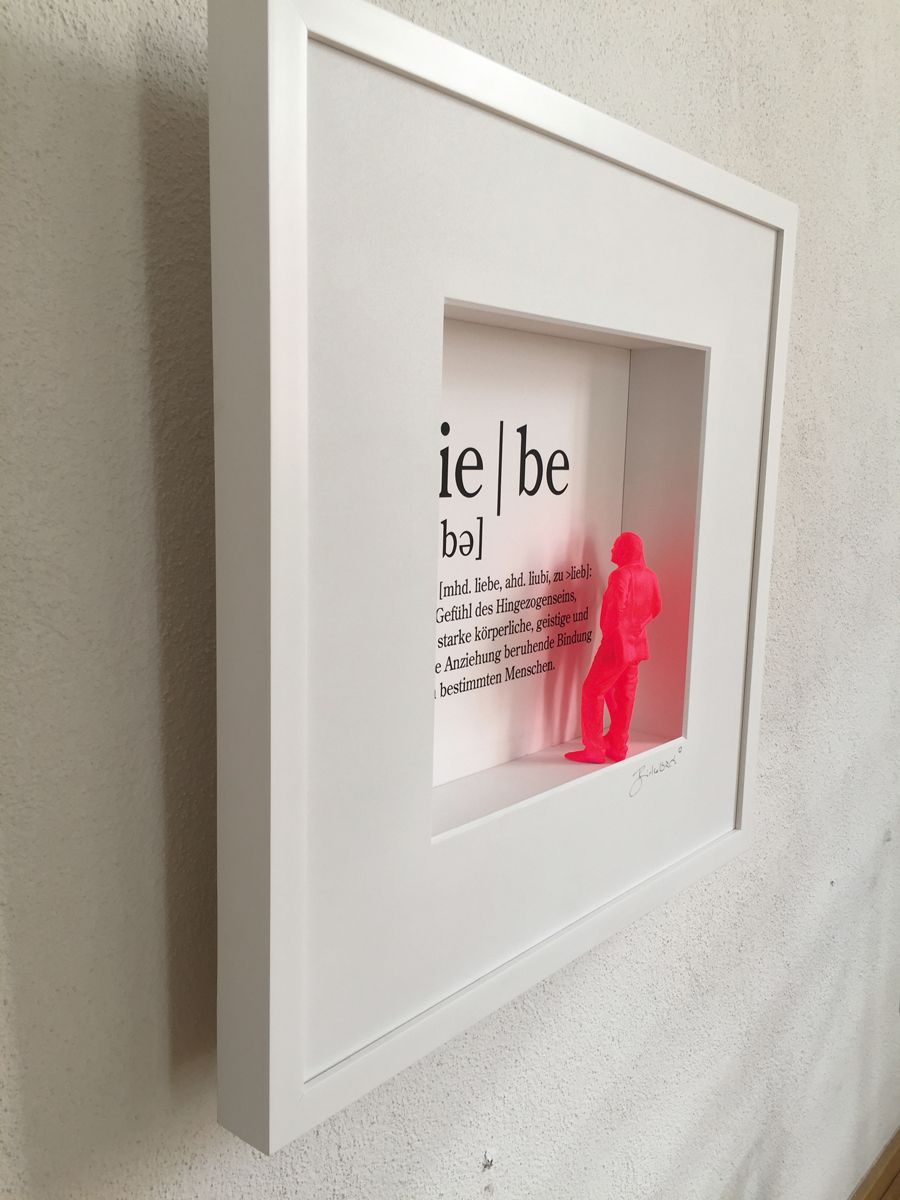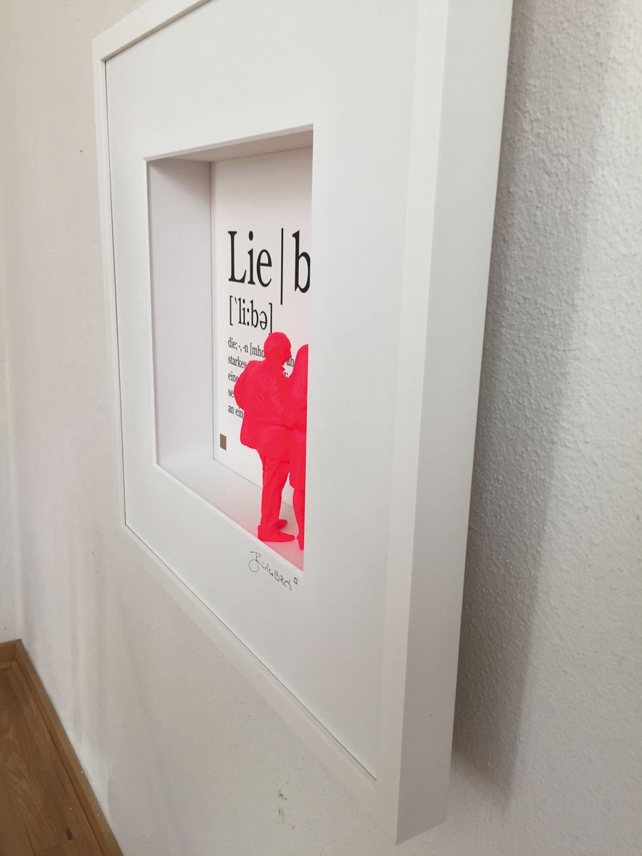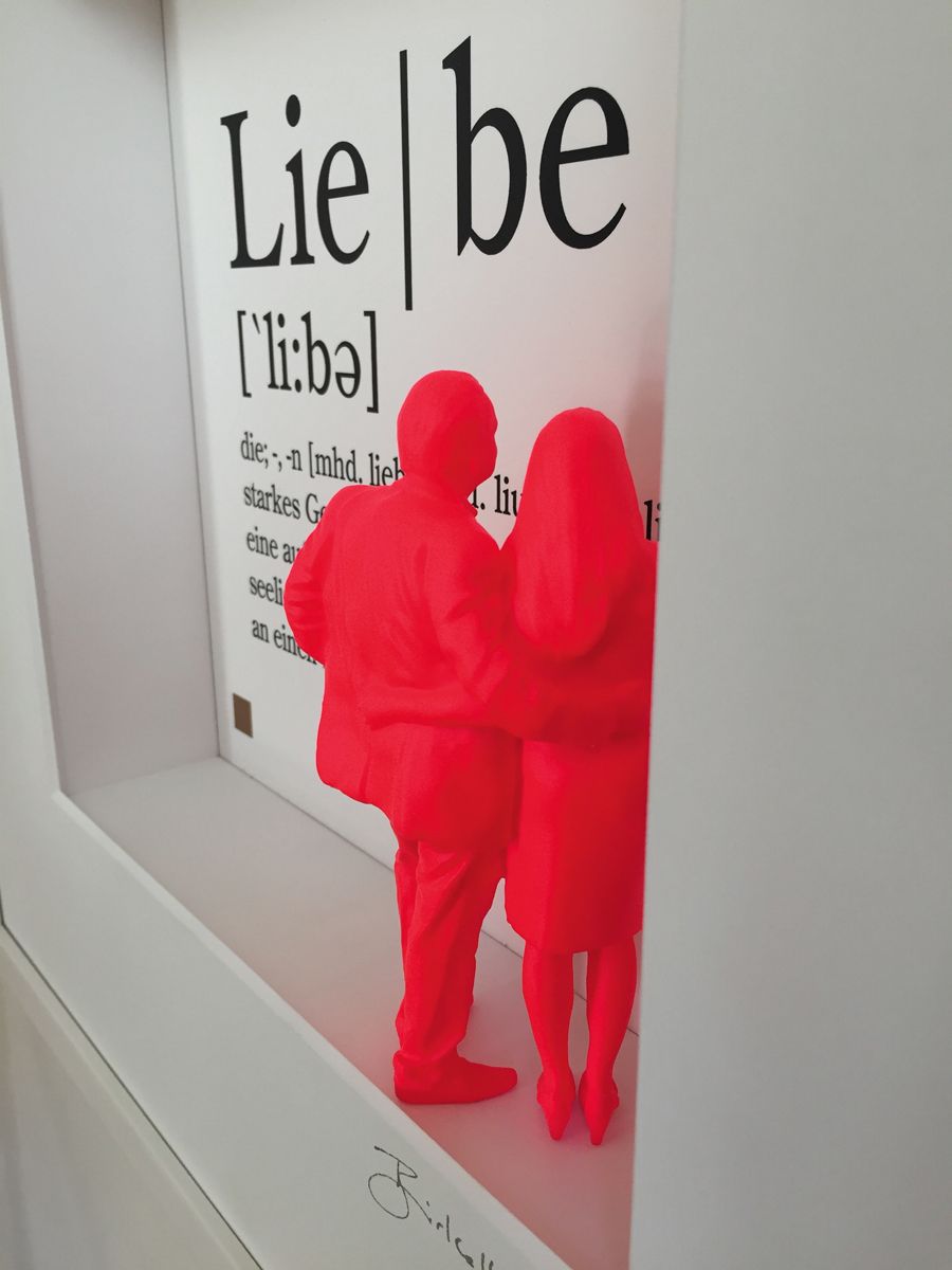 Liebe – sie ist so schön und doch so schwierig. Vielleicht hilft da manchmal ein Blick auf das Wesentliche der Liebe: das innige Vertrauen, das wunderbar über die Jahre wachsen kann. Vom Künstler durch ein 3D-Pärchen vor der Typographie des entsprechenden Duden-Textes dargestellt.