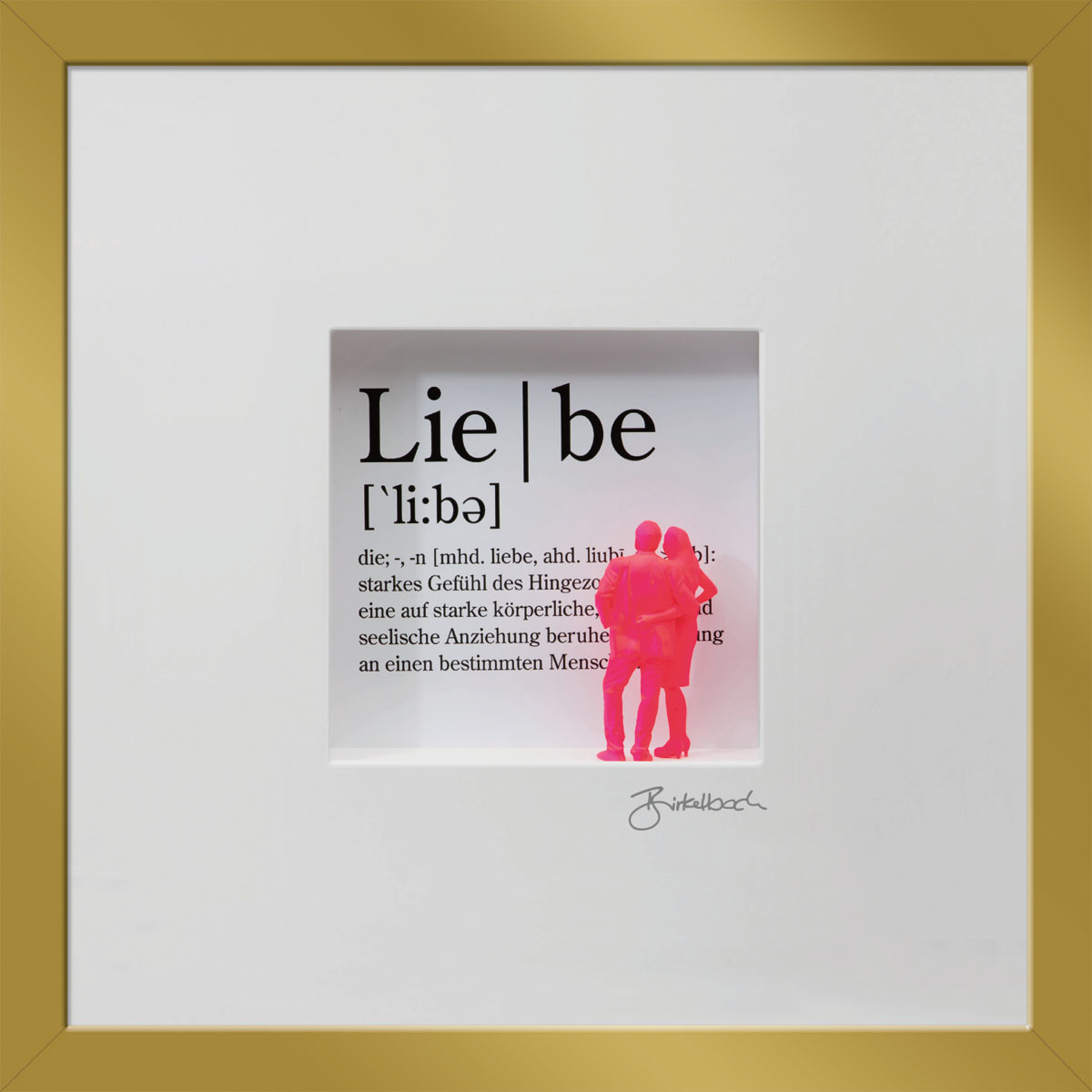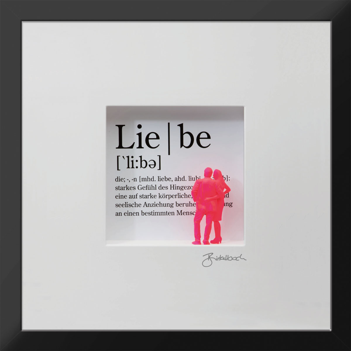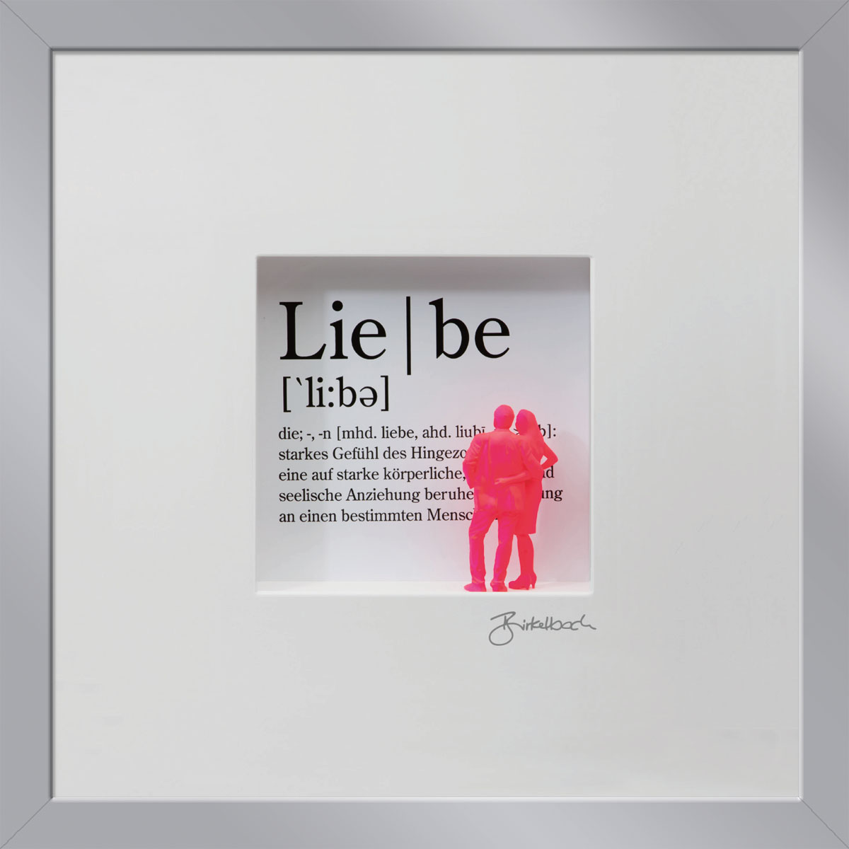 Liebe – sie ist so schön und doch so schwierig. Vielleicht hilft da manchmal ein Blick auf das Wesentliche der Liebe: das innige Vertrauen, das wunderbar über die Jahre wachsen kann. Vom Künstler durch ein 3D-Pärchen vor der Typographie des entsprechenden Duden-Textes dargestellt.