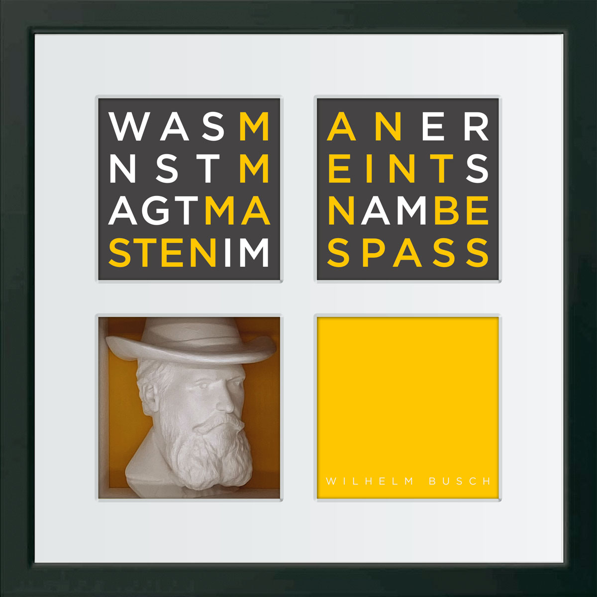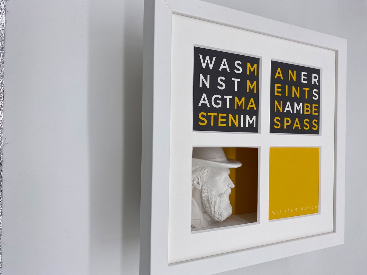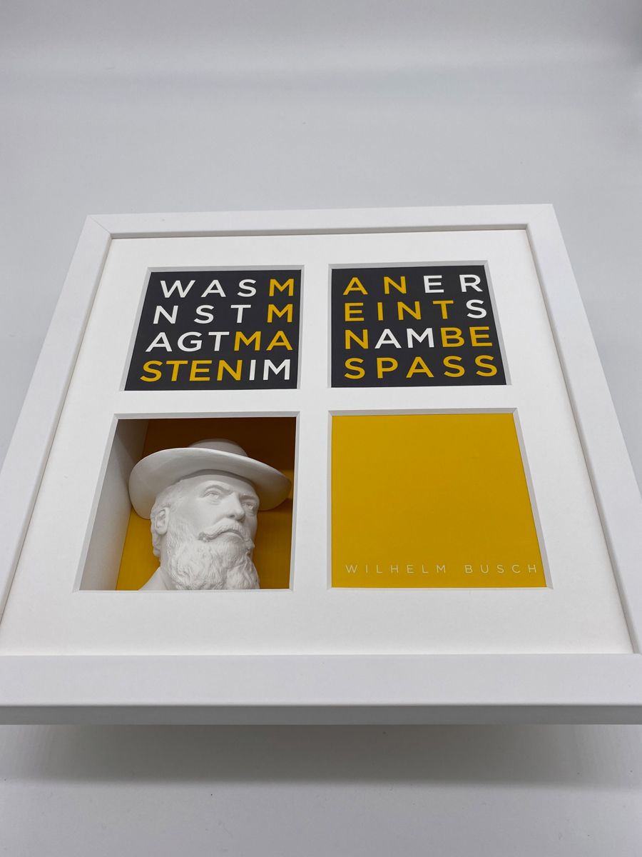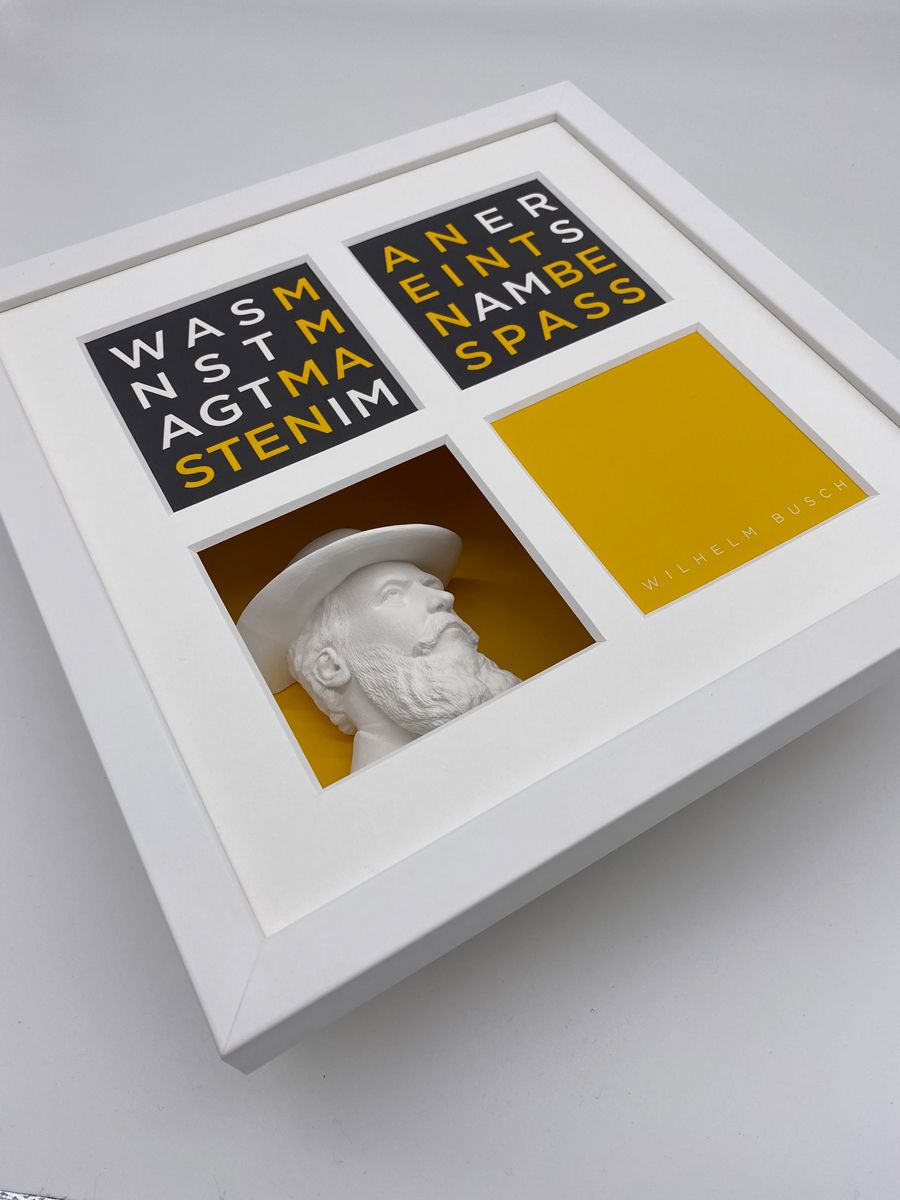 Die Exponate aus der Serie Büstenbilder bestehen im wesentlichen aus fünf Bestandteilen: einem Objektkasten mit eingesetzter 3D-Gipsbüste (1), einem aufgelegtem Digitalkarton (2), einem vierfach gestanztem Passpartout (3), einer blendfreien Verglasung (4) und einem hochwertigen Holz-Bilderrahmen (5). Die einzelnen Produktbestandteile werden kunsthandwerklich zusammengefügt nachdem die Büsten vor dem Einsetzen individuell geschliffen wurden. Daher können die Exponate leicht von der Darstellung im Katalog abweichen. Auf der Rückseite des Exponates ist ein Zertifikat angebracht, dass die Echtheit bestätigt und die Seriennummer ausweist. Es ist vom Künstler unterschrieben.