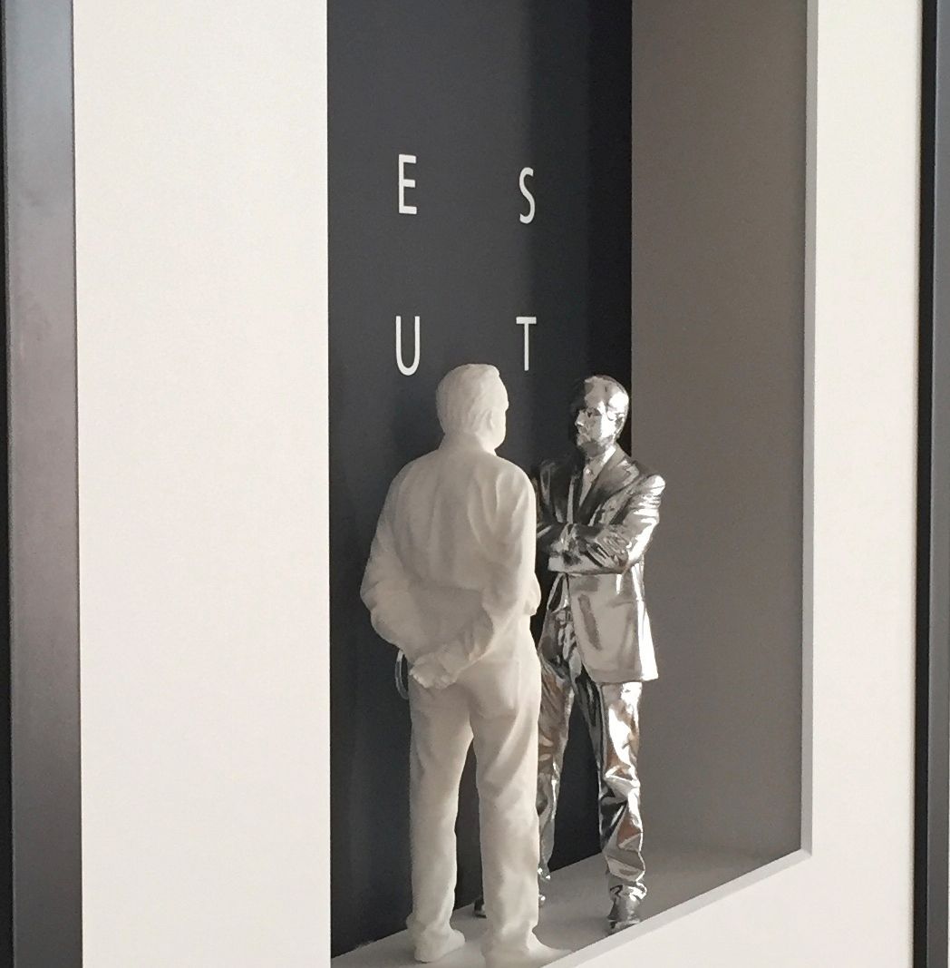 „Die Exponate aus der Serie „wortkunst3 I Objektbilder“ bestehen im wesentlichen aus vier bzw. fünf Bestandteilen: einem Objektkasten mit Hintergrundplatte aus Leinen-Kappa (1), einem dreidimensionalem Objektgegenstand (2), einem CNC-gefrästem und hochwertig lackiertem Holz-Passpartout (3) und einem hochwertigem Holz-Bilderrahmen (4). Optional sind die meisten Exponate mit einer fast blendfreien Verglasung erhältlich (5). Auf der Rückseite des Exponates ist ein Zertifikat angebracht, dass die Echtheit bestätigt und die Seriennummer ausweist. Die 3D-Objektgegenstände werden von Designern und CAD-Spezialisten nach Vorgabe entwickelt und mit modernsten 3D-Druckern erzeugt bzw. gefräst oder laser-gecutttet. Weitere dreidimensionale Gestaltungselemente ergänzen die Wort-Bild-Collagen. Die einzelnen Produktbestandteile werden kunsthandwerklich zusammengefügt und können daher leicht von der Darstellung im Katalog abweichen. Auf der Rückseite des Exponates ist ein Zertifikat angebracht, dass die Echtheit bestätigt und die Seriennummer ausweist. Es ist vom Künstler unterschrieben.“